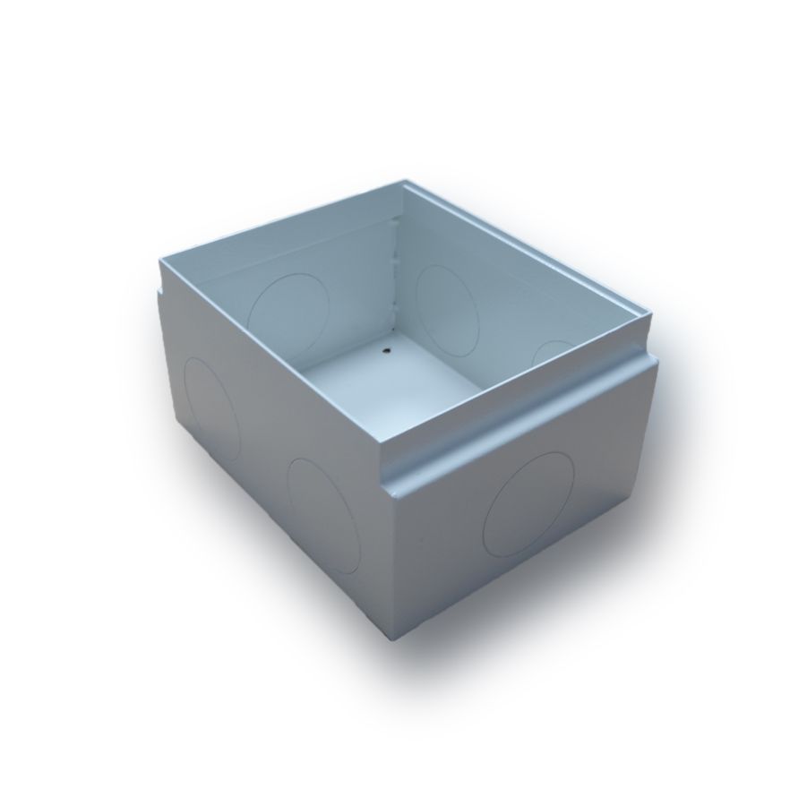 Obudowa (puszka) płytka do betonu do puszki z ramką EM/FLBSCF169P. Umożliwia montaż w wykutym otworze lub w betonie wylewanym. Zmniejszona głębokość, pozwala wykonać płytsze wkucie lub wylewkę o mniejszej grubości, co odbywa się kosztem mniejszej przestrzeni na kable w obudowie lub braku możliwości obniżenia płaszczyzny montażowej gniazd w puszce z ramką. Posiada osłabienia na ściankach do wybicia otworów do wprowadzenia przewodów.