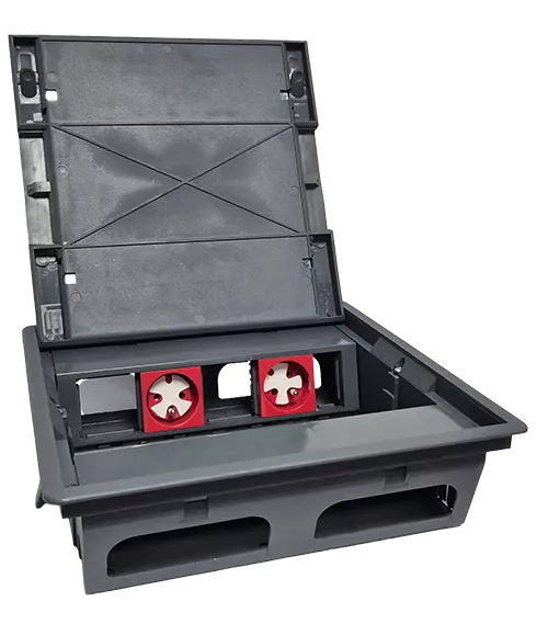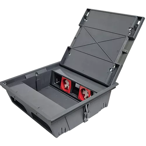 Puszka podłogowa z ramką do instalacji osprzętu w standardzie 45x45 (gniazda elektryczne, teletechniczne, itp.). Puszka przeznaczona do montażu w podłogach technicznych. Pojemność puszki 18 modułów 22,5x45 (8 odułów 5x45 mm + 2 moduły 22,5x45 mm). Umożliwia przygotowanie estetycznego punktu abonenckiego teletechnicznego wraz z siecią elektryczną. Pokrywa ramki wzmocniona blachą stalową i przystosowana do wklejenia wykładziny dywanowej o grubości do ok. 8 mm. Ramka posiada uchwyty montażowe do płyt podłogi technicznej. Puszka do osadzenia ramki posiada osłabienia boczne do wprowadzenia kanałów lub przewodów i płynną regulację wysokości za pomocą śrub