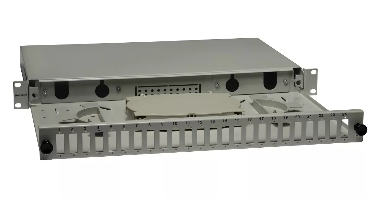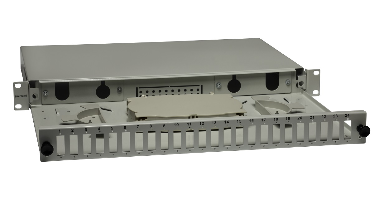 Przełącznica wysuwana 19" 1U 24xSC duplex (SC Duplex / LC Quad), szara; w komplecie kasety światłowodowe na 48 wł. i dławiki