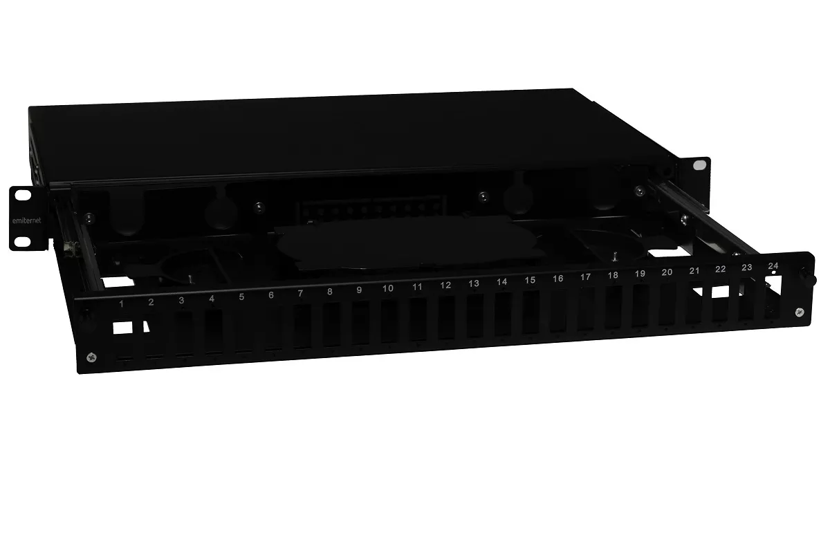 Przełącznica wysuwana 19" 1U 24xSC duplex teleskopowa (SC Duplex / LC Quad), czarna; w komplecie kasety światłowodowe na 48 wł. i dławiki