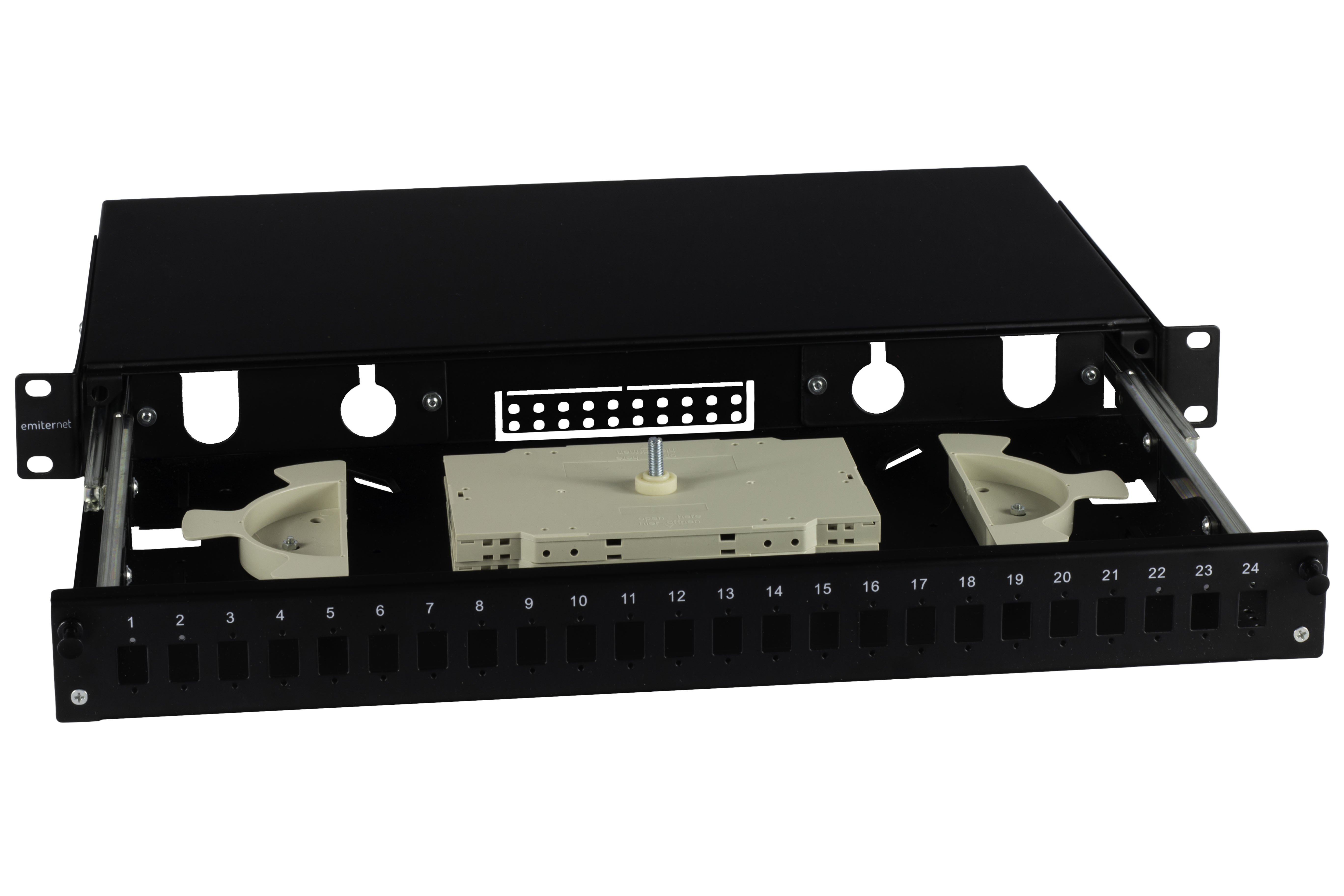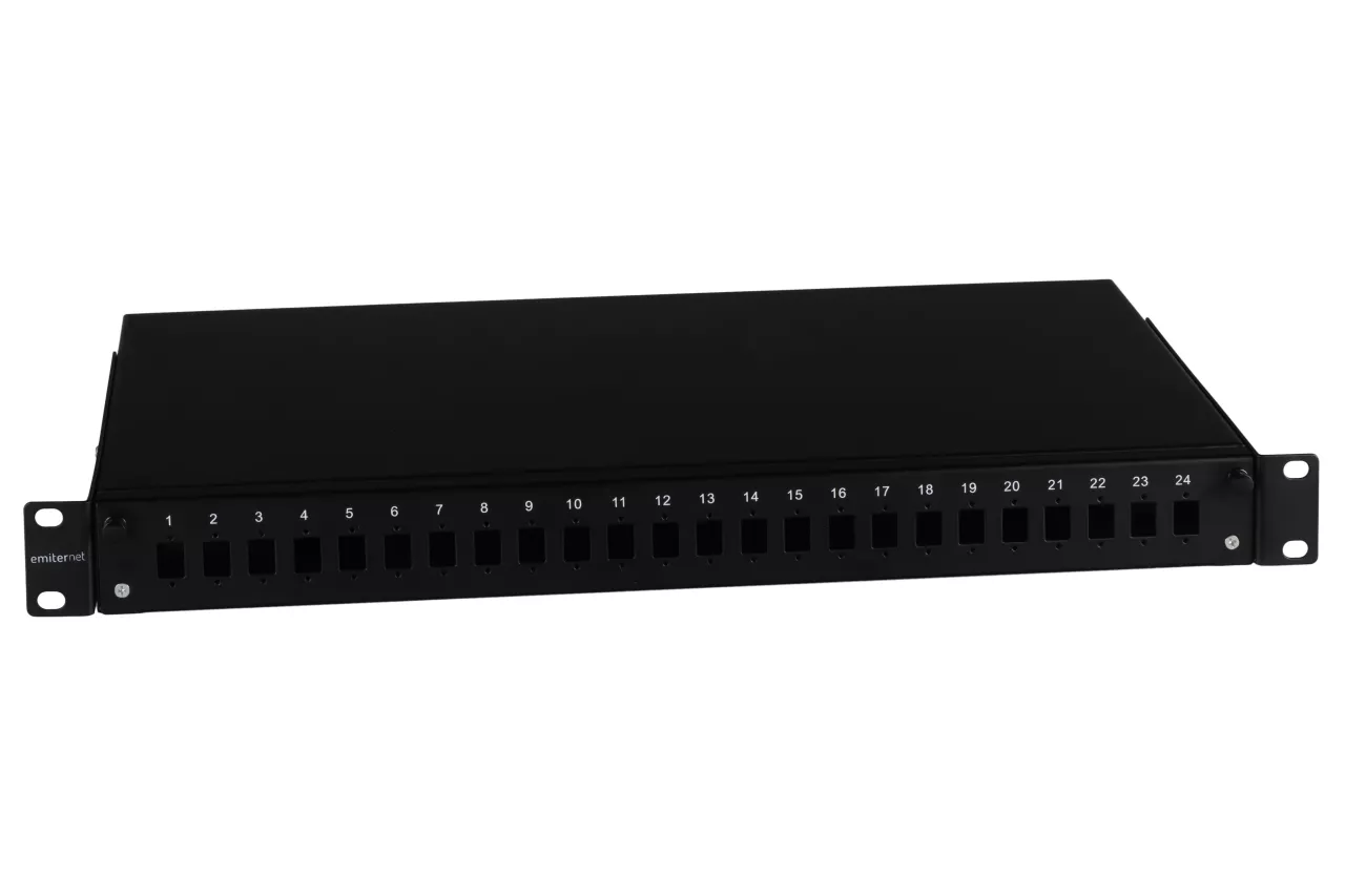 Przełącznica wysuwana 19" 1U 24xSC simplex teleskopowa (SC Simplex / E2000 / MTRJ / LC Duplex), czarna; w komplecie kasety światłowodowe na 24 wł. i dławiki