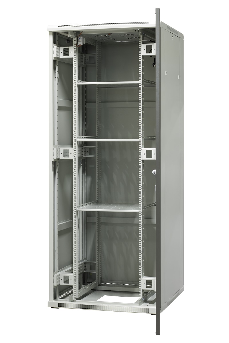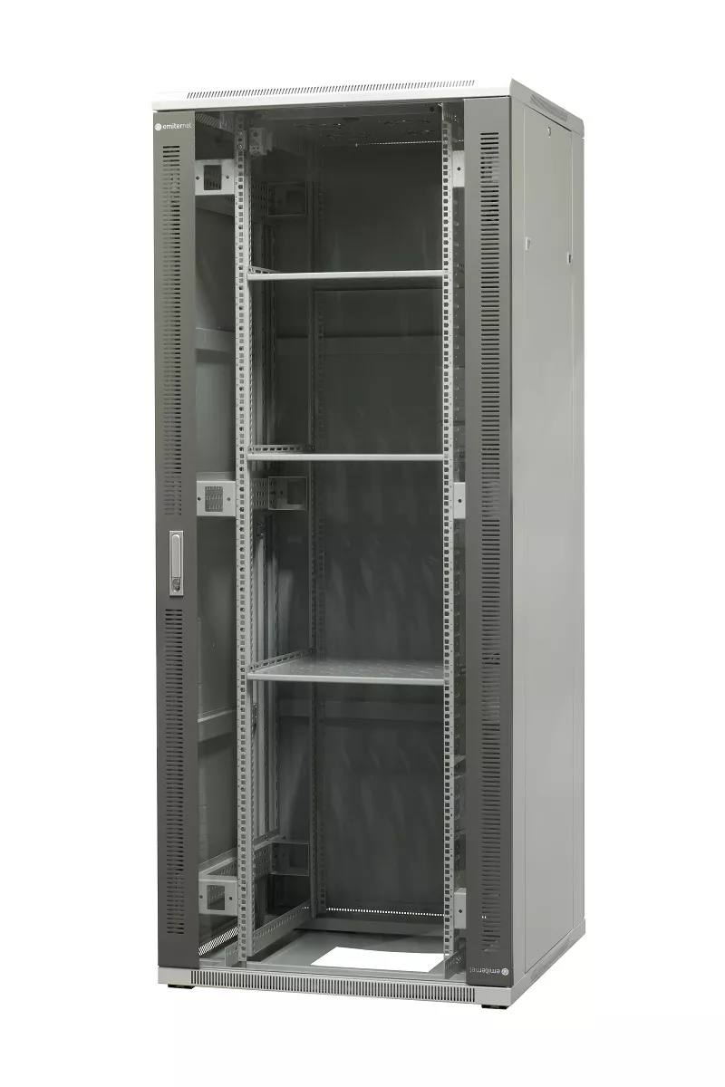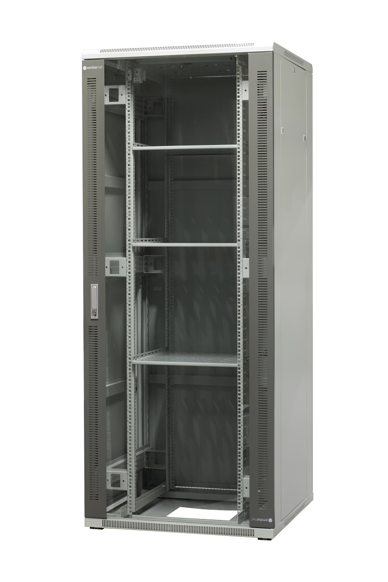 Zaawansowany model szaf teleinformatycznych rack stojących z bogatym wyposażeniem. Konstrukcja szafy wykonana z blachy stalowej. Rama skręcana z profili stalowych, przystosowana do ustawienia na nóżkach poziomych lub montowana na cokole. W dachu panel wentylacyjny, 2 lub 4 wentylatory. Rama zawiera trzy otwory wprowadzające do kabli (300x40mm). 4 nóżki poziomujące. Drzwi przednie z wklejoną szybą hartowaną i zamkiem 1-punktowym wyposażonym w dźwignię obrotową zamontowane na zawiasach umożliwiających otwarcie drzwi o 180 stopni. Drzwi tylne oraz dwie ściany boczne z blachy stalowej, zdejmowane, mocowane przy pomocy zamków jednopunktowych. 3 poziome trawersy służące do mocowania pionowych profili. 4 pionowe profile montażowe, minimalna odległość od drzwi przednich 35mm (standardowo 95mm). Możliwość regulacji położenia co 20 mm. Linka uziemiająca na wyposażeniu. Półki stałe mocowane w 4 punktach, 20 śrub montażowych oraz komplet 2 wentylatorów (szafy 24U, 32U i 42U 600x600) lub 4 wentylatorów (pozostałe rozmiary szaf) i termostat w standardowym wyposażeniu. Szafy rackowe przeznaczone są do stosowania wewnątrz pomieszczeń. Możliwość łączenia szaf w rzędy (z wykorzystaniem łącznika do szaf z serii EmiterNet). Możliwość zastosowania kół jezdnych (przy zastosowaniu kółek jezdnych maksymalna nośność statyczna nie może przekraczać 150 kg). Możliwość ustawienia na cokołach. Szafy stojące dostarczane są kompletnie zmontowane na palecie drewnianej, zapakowane w karton (czapy kartonowe na dachu, narożniki kartonowe i osłony boczne z kartonu), owinięte folią stretch.