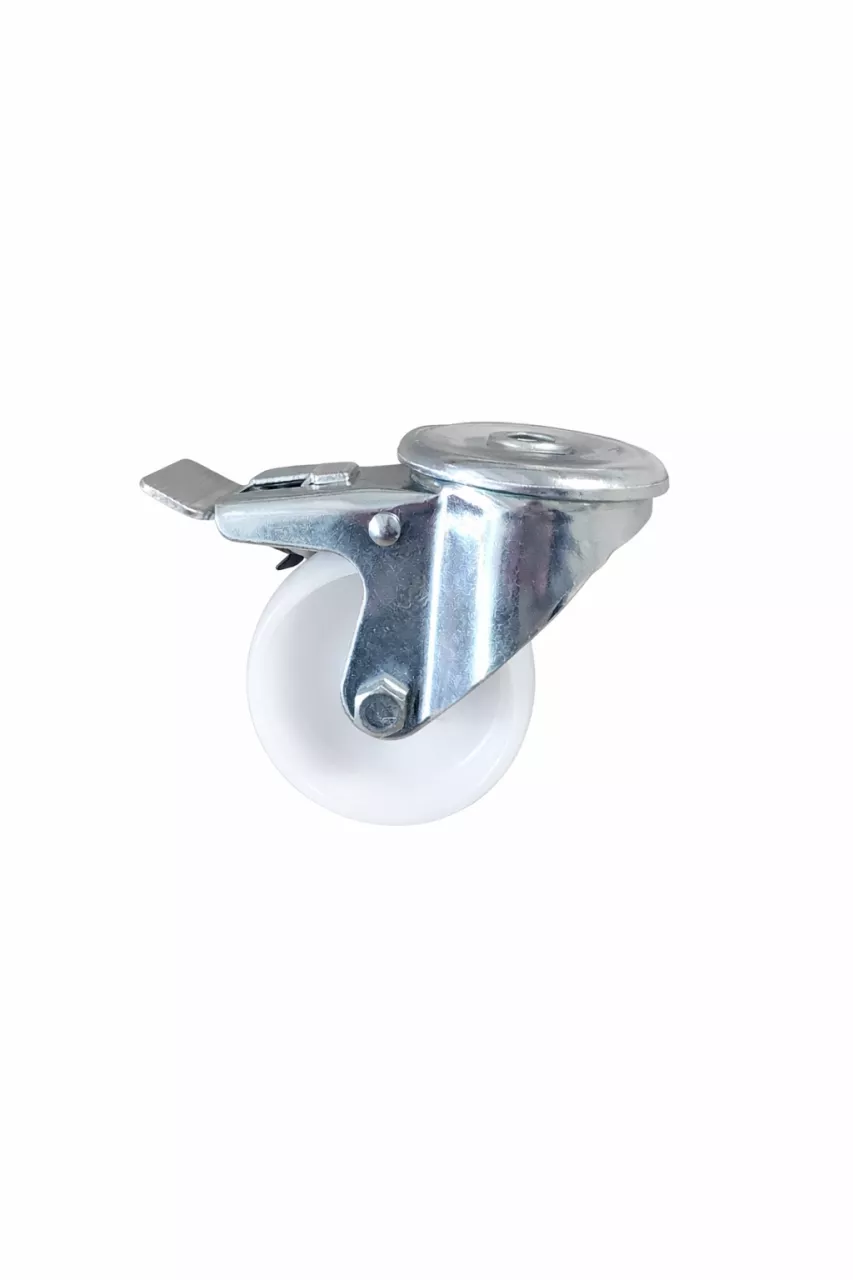 Kółka jezdne łożyskowane w 2 płaszczyznach, wyposażone w trzpień z gwintem M12. Dwa koła skrętne + dwa koła skrętne z hamulcem.