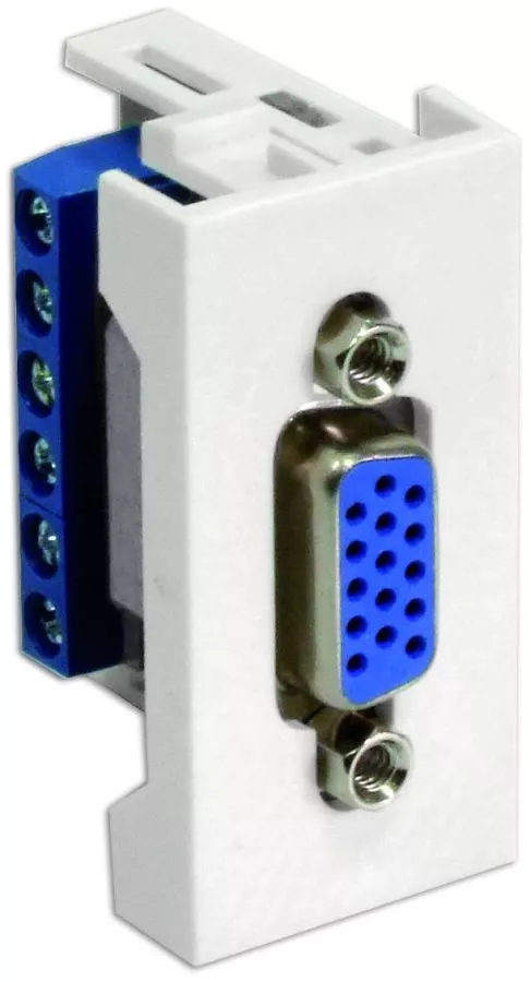 Gniazdo niskopradowe VGA w adapterze 22,5x45 (1 moduł), montaż w standardzie 45x45, złącze D-Sub 15-pin żeńskie, podłączenie przewodów na zacisk śrubowy 6-pin(RGB). Charakteryzuje sie zwartą kompaktową budową dzięki czemu można je używać w kanałach kablowych o głębokości już od 40mm. Przeznaczone do zastosowania w systemach teleinformatycznych i audio/video( monitor ). Montaż przez zatrzaśnięcie w uchwycie szybkiego montażu UCHKP, obudowie natynkowej OBUK, ramce maskującej RAMK.