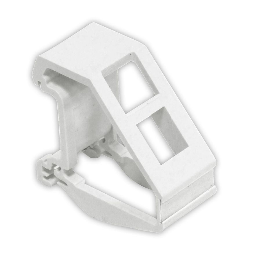 Adapter kątowy na szynę DIN, umożliwia montaż jednego gniazda typu keystone w rozdzielnicach elektrycznych. Montaż na szynie DIN (TH35) poprzez zatrzask. Uchwyt w łatwy sposób umożliwia montaż gniazd teletechnicznych lub specjalnych.