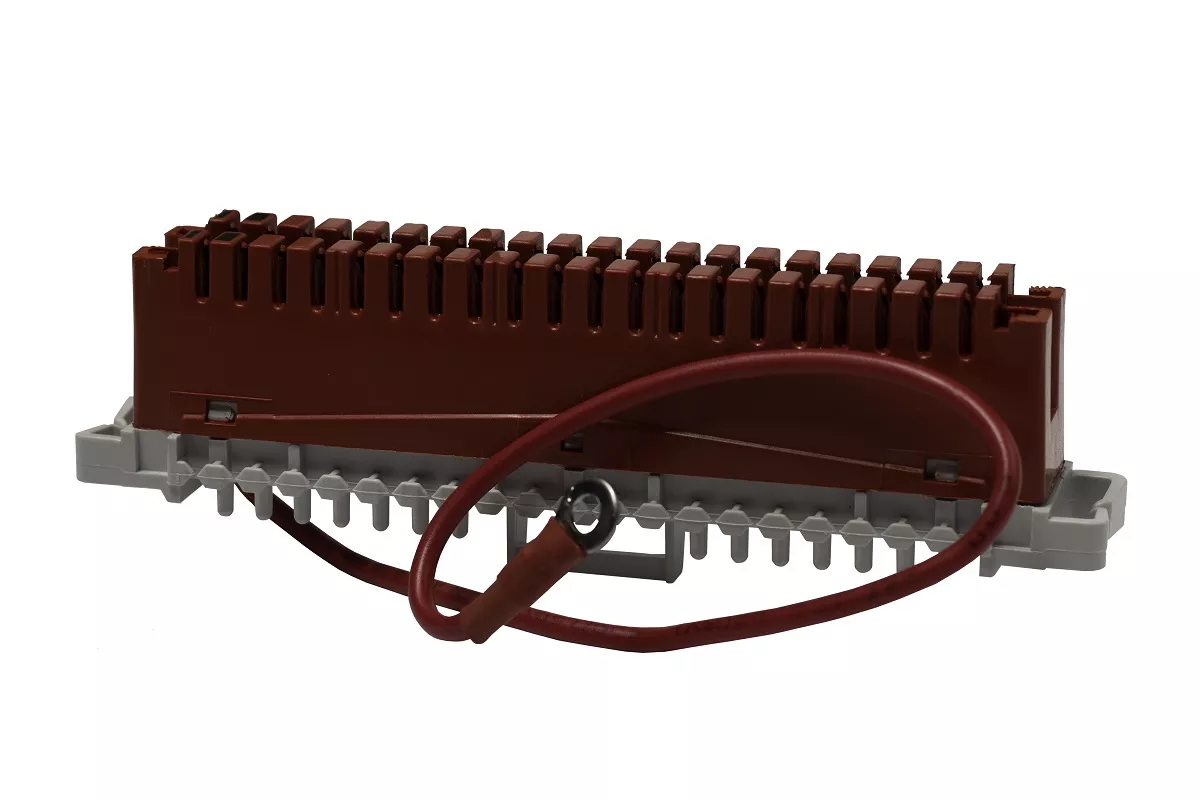 Moduł uziemiający pozwala na wpięcie ekranów kabli przychodzących do przełącznicy telefonicznej. Posiada dodatkowo kabel do podłączenia uziemienia łączówki.