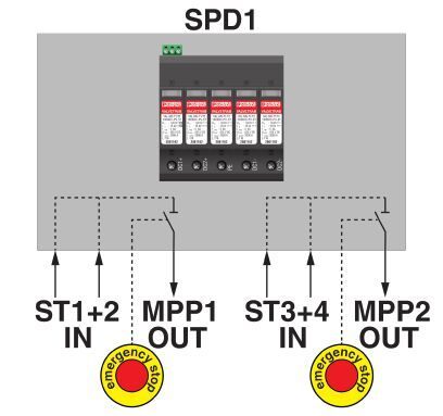Zawiera: dwa ogr. przep.T1/T2 w jednej podstawie,dwa rozłącz. ppoż DC ze zdalnym dost.,obudowa szczelna(IP65) z wyprowadzonymi dławnicami