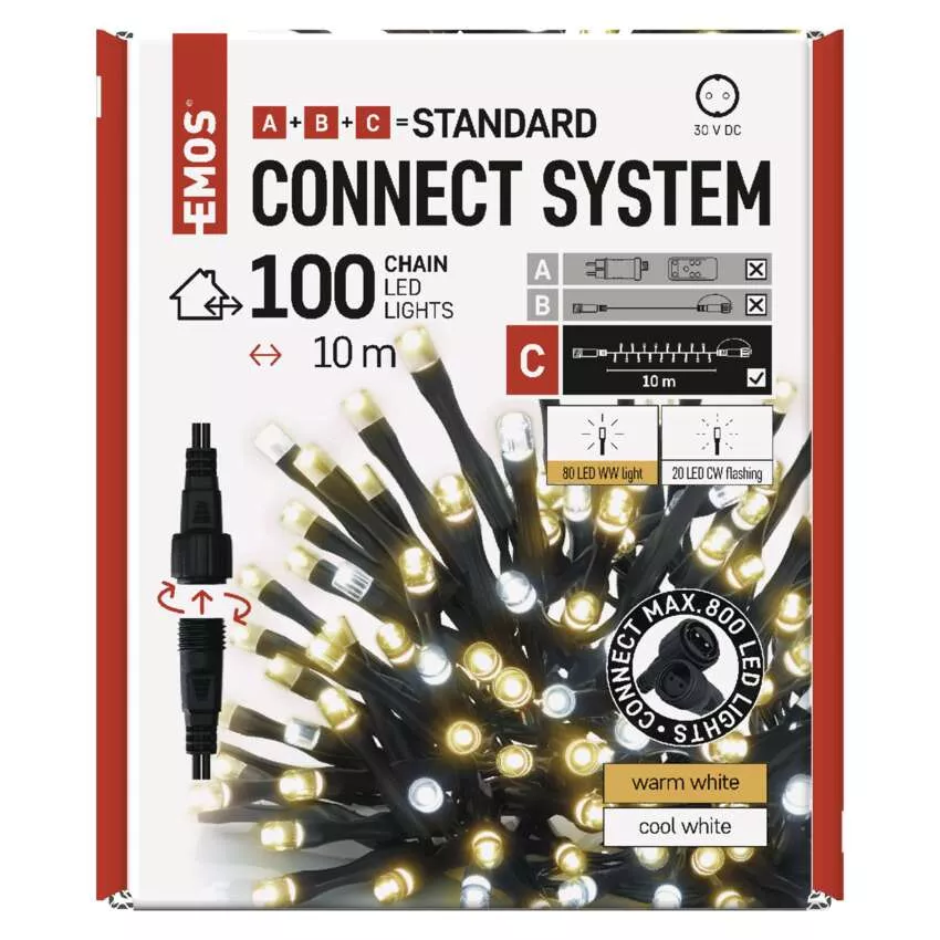 Oświetlenie łączone Standard - łańcuch 100 LED 10m ciepła + zimna biel, miga, IP44, timer