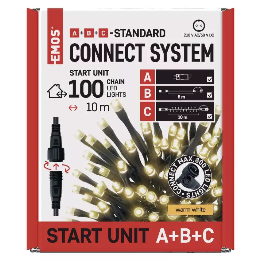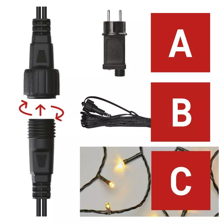 typ zasilania: zasilacz sieciowy, kształt: klasyczny, ilość LED: 100, odstęp między diodami LED: 10 cm, wielkość diod LED: 5 mm, długość przewodu: 5 m, do wysokości choinki: nie dotyczy, kolor przewodów: czarny, moc: max. 12 W, napięcie wejściowe: 230 V AC, napięcie wyjściowe: 30 V DC, możliwość podłączenia: tak, stopień ochrony: IP44, żywotność: 10 000 godzin, materiał: PVC, okres gwarancyjny: 2 lata, opakowanie: 1 szt., pudełko