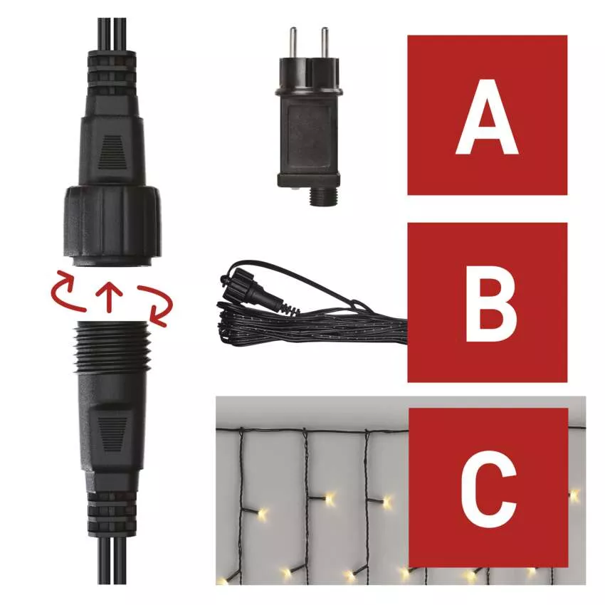 produkt: sople, barwa światła: ciepła biel, wymiary: 2,5 × 0,9 m, zastosowanie: zewnętrzne i wewnętrzne, timer, pilot zdalnego sterowania: nie, funkcje: świeci, typ zasilania: zasilacz sieciowy, ilość LED: 100, długość przewodu: 5 m, do wysokości choinki: nie dotyczy, kolor przewodów: czarny, moc: max. 12 W, napięcie wejściowe: 230 V AC, napięcie wyjściowe: 30 V DC, możliwość podłączenia: tak, stopień ochrony: IP44, żywotność: 10 000 godzin, materiał: PVC, okres gwarancyjny: 2 lata, opakowanie: 1 szt., pudełko