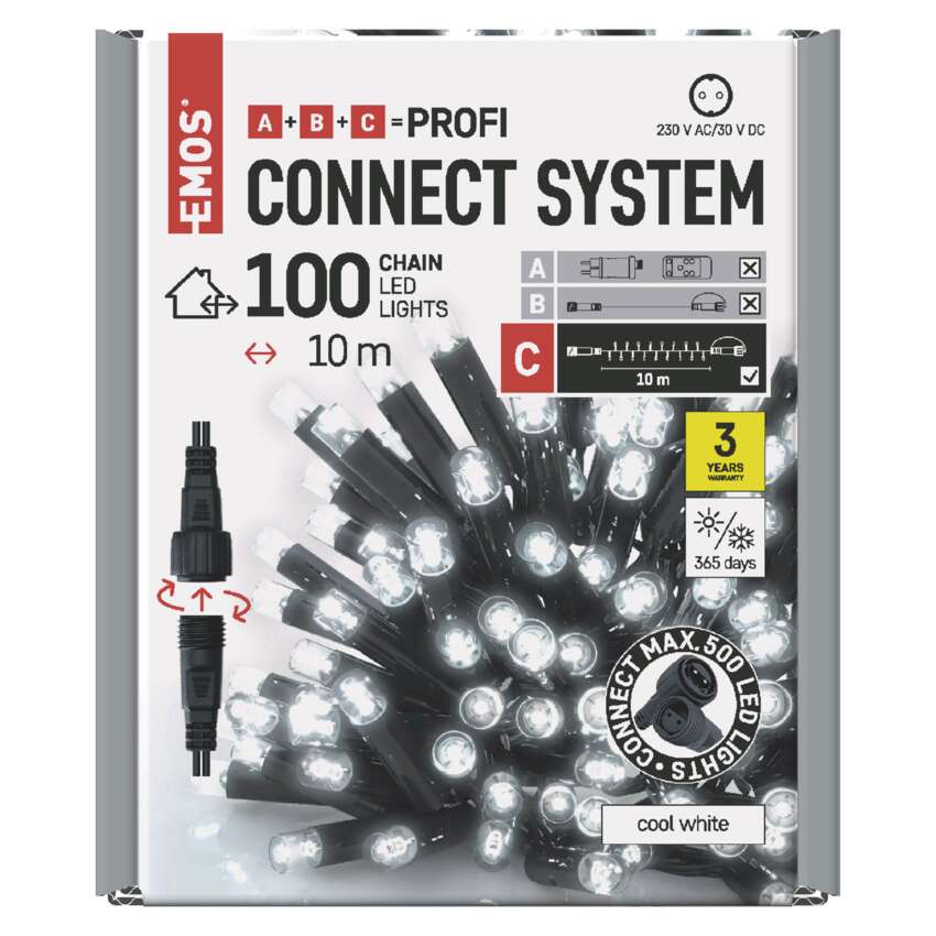 Oświetlenie łączone Profi - łańcuch 100 LED 10m zimna biel, czarny przewód, IP44