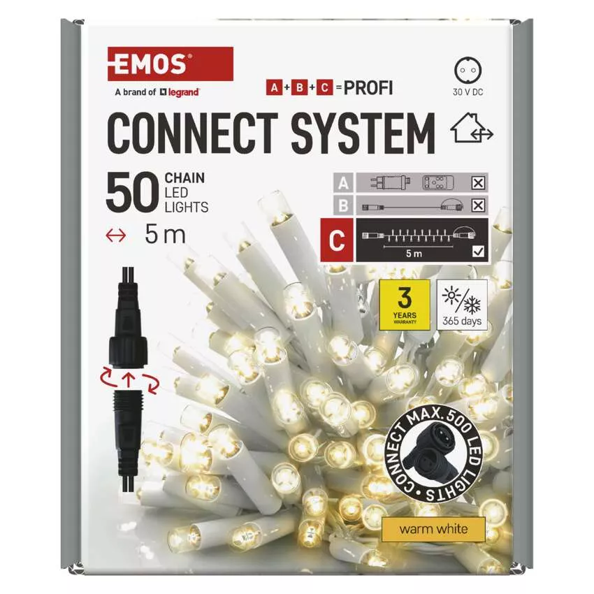 Oświetlenie łączone Profi - łańcuch 50 LED 5m ciepła biel, biały przewód, IP44