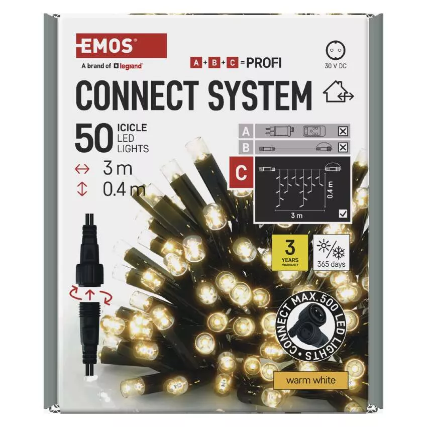 Oświetlenie łączone Profi - sople 50 LED 3m ciepła biel, czarny przewód, IP44
