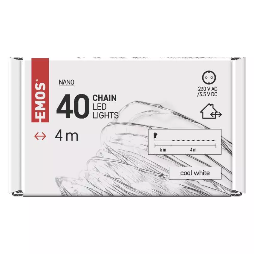 typ zasilania: zasilacz sieciowy, kształt: nano, ilość LED: 40, odstęp między diodami LED: 10 cm, wielkość diod LED: 3 mm (nano), długość przewodu: 5 m, do wysokości choinki: 100 cm, kolor przewodów: srebrna, moc: 2,1 W, napięcie wejściowe: 230 V AC, napięcie wyjściowe: 3,5 V DC, możliwość podłączenia: nie, stopień ochrony: IP44, żywotność: 10 000 godzin, materiał: metalowy, okres gwarancyjny: 2 lata, opakowanie: 1 szt., pudełko