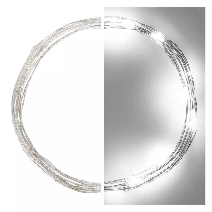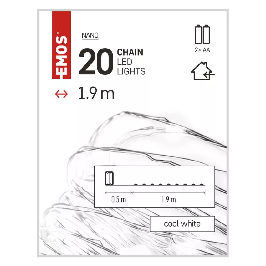 typ zasilania: baterie 2× AA (brak w zestawie), kształt: nano, ilość LED: 20, odstęp między diodami LED: 10 cm, wielkość diod LED: 3 mm (nano), długość przewodu: 0,5 m, do wysokości choinki: nie dotyczy, kolor przewodów: srebrna, moc: 1,28 W, napięcie wyjściowe: 3 V DC, możliwość podłączenia: nie, stopień ochrony: IP20, żywotność: 10 000 godzin, materiał: metalowy, okres gwarancyjny: 2 lata, opakowanie: 1 szt., pudełko