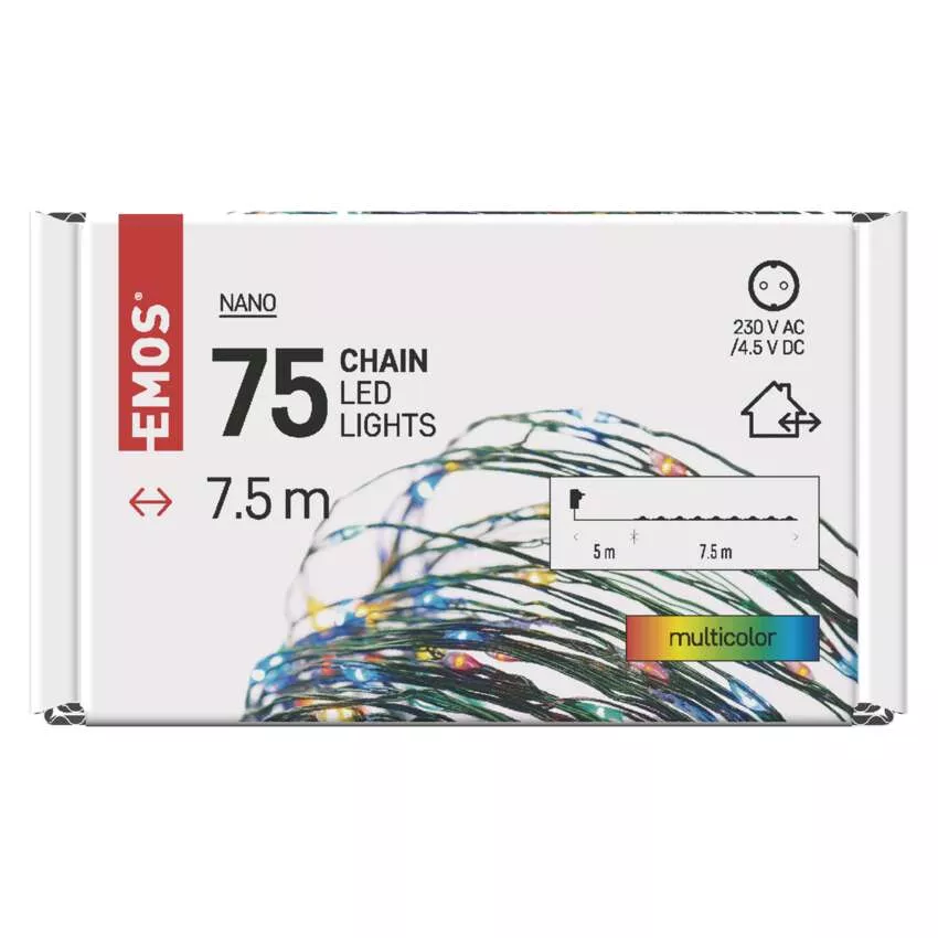 typ zasilania: zasilacz sieciowy, kształt: nano, ilość LED: 75, odstęp między diodami LED: 10 cm, wielkość diod LED: 3 mm (nano), długość przewodu: 5 m, do wysokości choinki: 140 cm, kolor przewodów: zielony, moc: 2,7 W, napięcie wejściowe: 230 V AC, napięcie wyjściowe: 4,5 V DC, możliwość podłączenia: nie, stopień ochrony: IP44, żywotność: 10 000 godzin, materiał: metalowy, okres gwarancyjny: 2 lata, opakowanie: 1 szt., pudełko