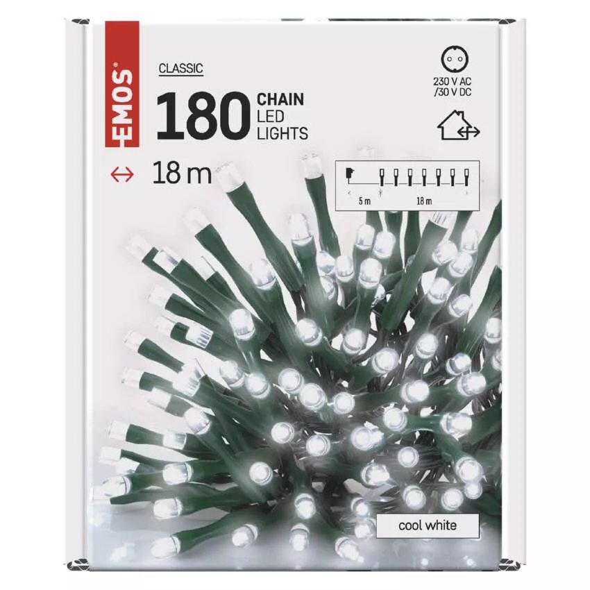 typ zasilania: zasilacz sieciowy, kształt: klasyczny, ilość LED: 180, odstęp między diodami LED: 10 cm, wielkość diod LED: 5 mm, długość przewodu: 5 m, do wysokości choinki: 200 cm, kolor przewodów: zielony, moc: 3,6 W, napięcie wejściowe: 230 V AC, napięcie wyjściowe: 31 V DC, możliwość podłączenia: nie, stopień ochrony: IP44, żywotność: 10 000 godzin, materiał: PVC, okres gwarancyjny: 2 lata, opakowanie: 1 szt., pudełko