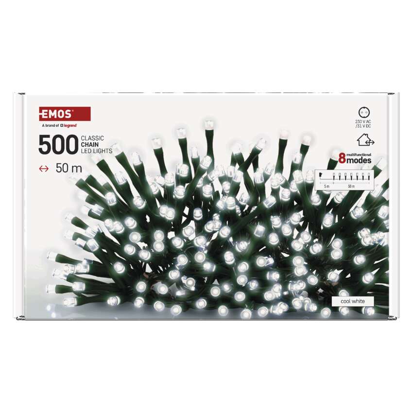 Lampki choinkowe Classic 500 LED 50m zimna biel, zielony przewód, IP44, 8 programów, timer