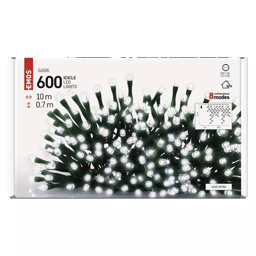Oświetlenie świąteczne sople 600 LED 10m, zimna biel, zielony przew., 8 programów, IP44