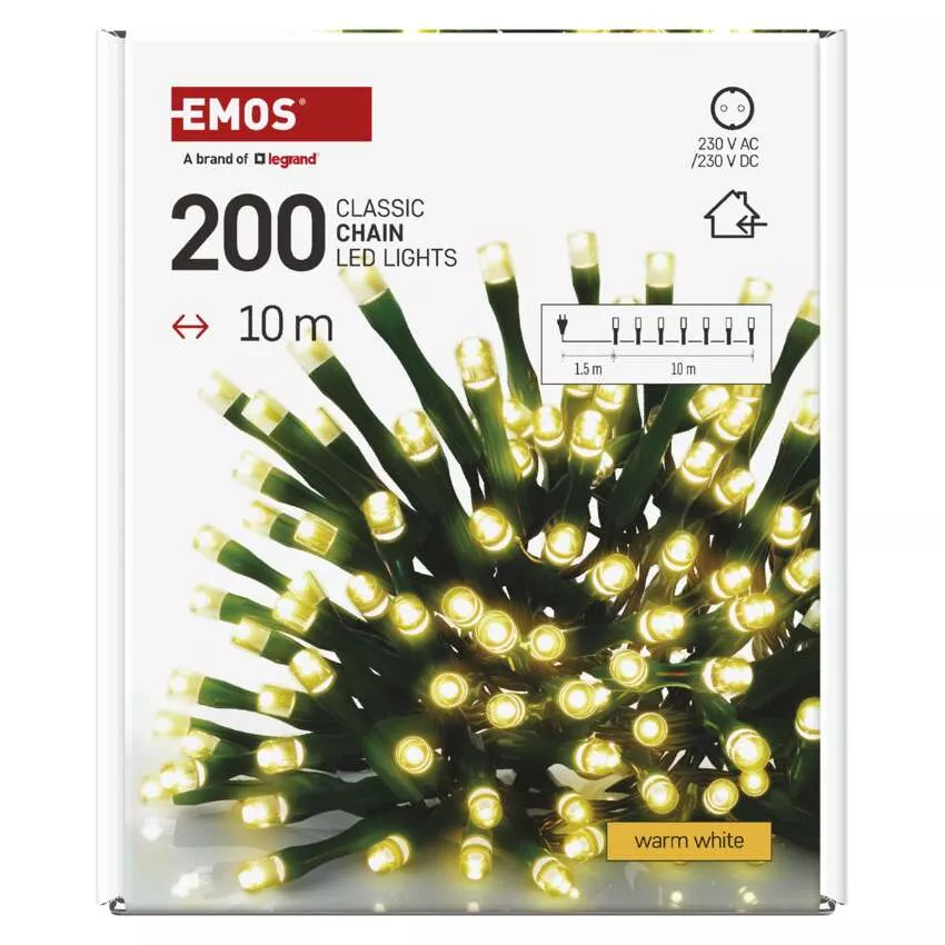 produkt: łańcuch, barwa światła: ciepła biel, wymiary: 10 m, zastosowanie: wewnętrzne, timer: nie, pilot zdalnego sterowania: nie, funkcje: świeci, typ zasilania: sieć, kształt: klasyczny, ilość LED: 200, odstęp między diodami LED: 5 cm, wielkość diod LED: 5 mm, długość przewodu: 1,5 m, do wysokości choinki: 200 cm, kolor przewodów: zielony, moc: 12 W, napięcie wejściowe: 230 V AC, napięcie wyjściowe: 230 V DC, możliwość podłączenia: nie, stopień ochrony: IP20, żywotność: 10 000 godzin, materiał: PVC, okres gwarancyjny: 2 lata, opakowanie: 1 szt., pudełko