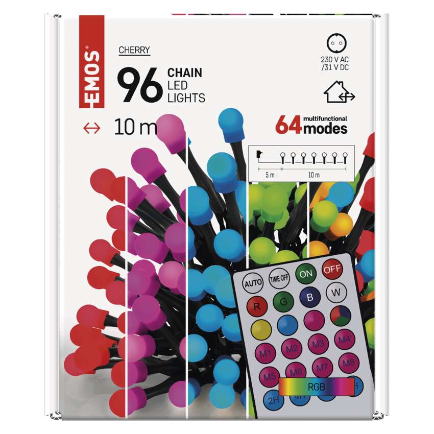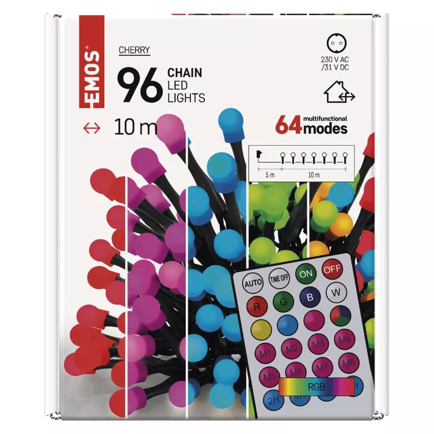 Lampki choinkowe 96LED cherry 10m, RGB, 64 programy, pilot, IP44, timer