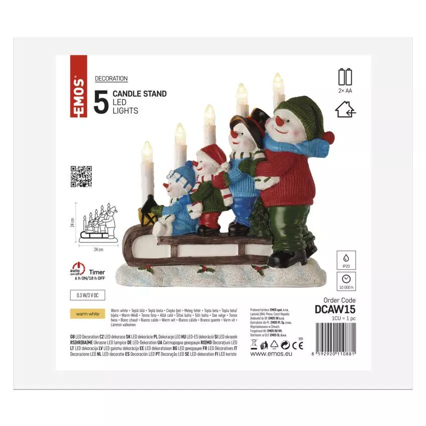 Dekoracje - świecznik 5LED - bałwanki na sankach, 24 cm 2xAA biały ciepła biel, IP20, tim.