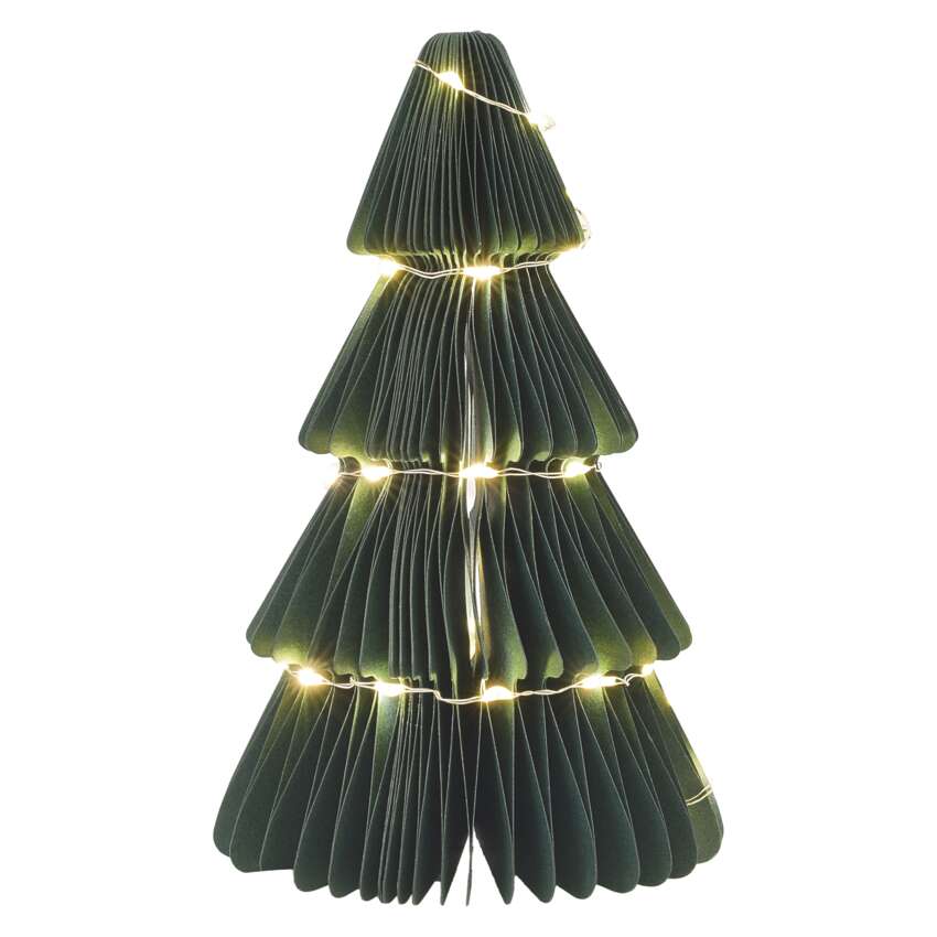 produkt: choinka, barwa światła: ciepła biel, wymiary: 9,5 × 9,5 × 14,8 cm, zastosowanie: wewnętrzne, timer, pilot zdalnego sterowania: nie, typ zasilania: baterie 2× AA (brak w zestawie), źródło światła: LED, ilość LED: 35, długość przewodu: 0,3 m, moc: 0,36 W, napięcie wyjściowe: 3 V DC, stopień ochrony: IP20, żywotność: 10 000 godzin, materiał: papier, okres gwarancyjny: 2 lata, opakowanie: 1 szt., pudełko