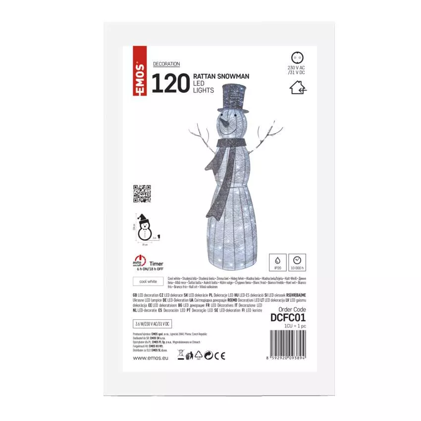Dekoracje - 120 LED bałwan 124 cm, zimna biel, IP20, timer