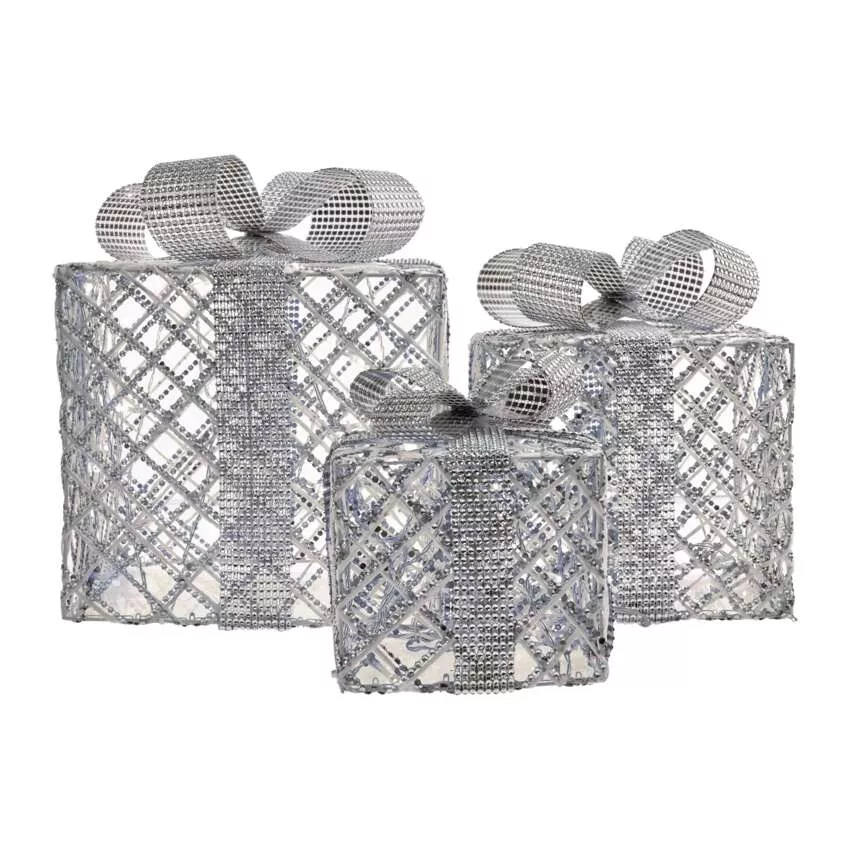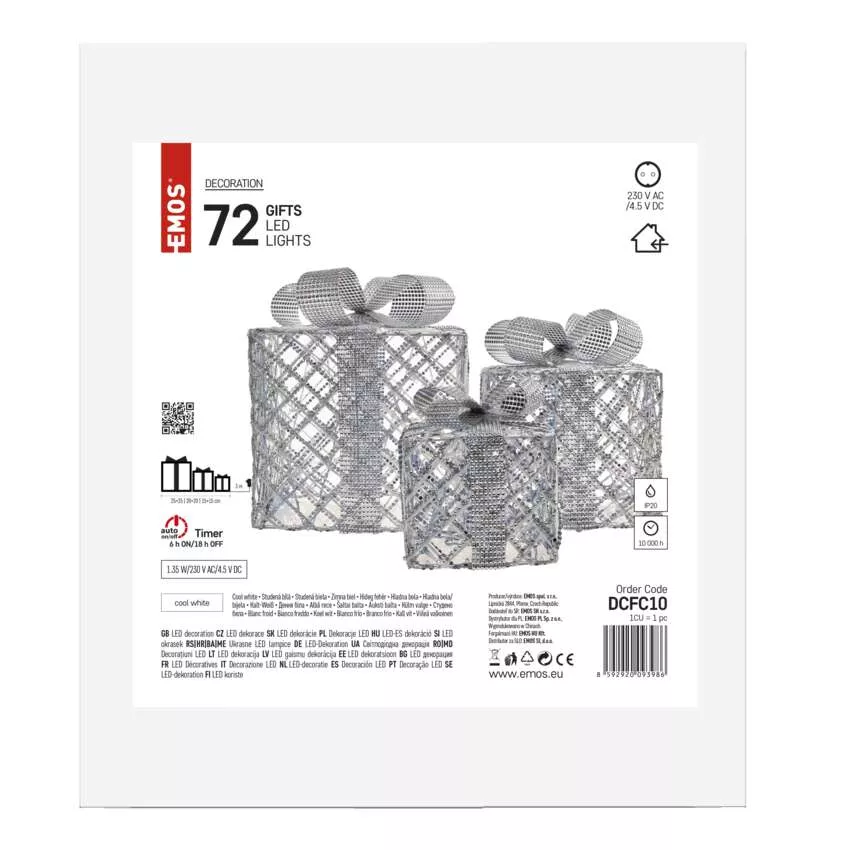 Dekoracje - 72 LED prezenty 15/20/25 cm srebrne, zimna biel, IP20, timer