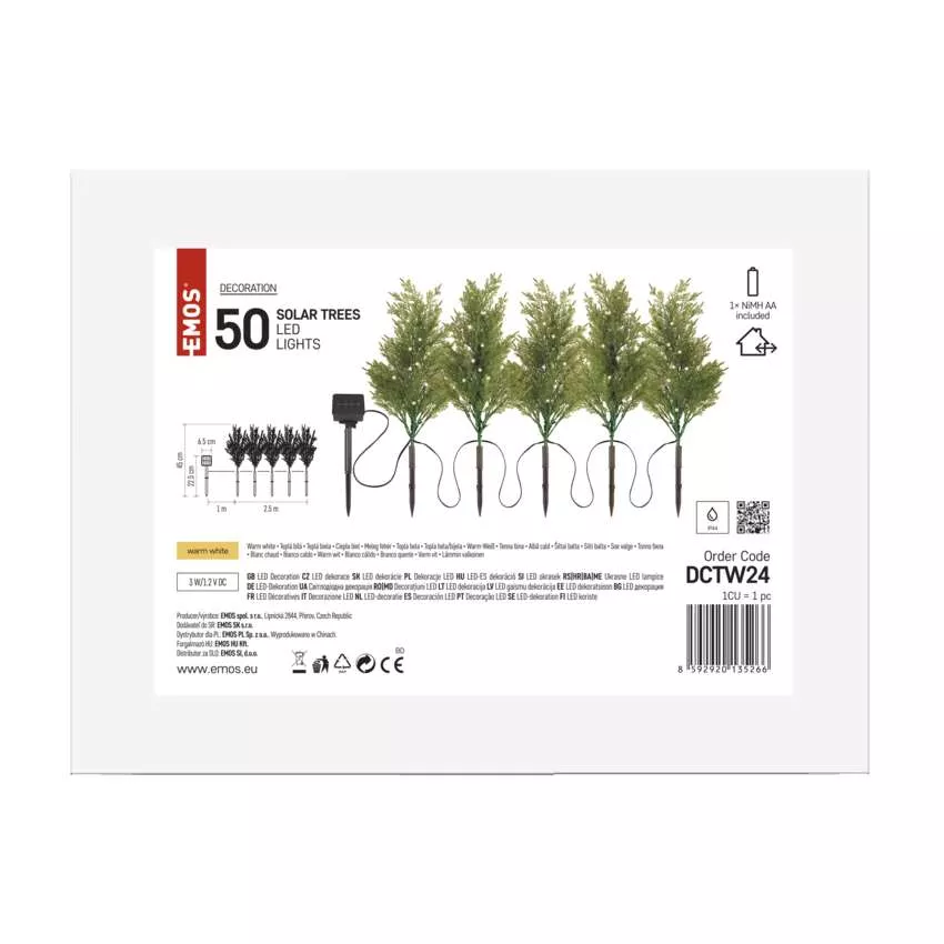 typ zasilania: baterie (1× NiMH, 600 mAh, AA Solar), źródło światła: LED, ilość LED: 50, kolor przewodów: czarny, moc: 3 W, napięcie wyjściowe: 1,2 V DC, stopień ochrony: IP44, żywotność: 10 000 godzin, materiał: tworzywo, okres gwarancyjny: 2 lata, opakowanie: 1 szt., pudełko