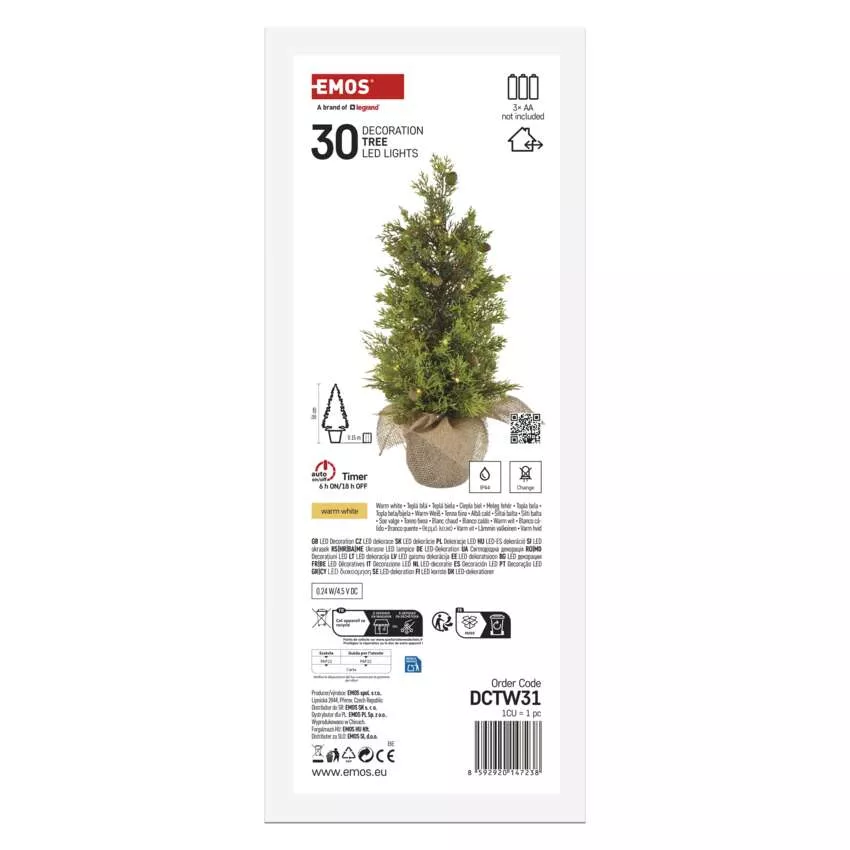 produkt: choinka, barwa światła: ciepła biel, wymiary: 50 cm, zastosowanie: zewnętrzne i wewnętrzne, timer, pilot zdalnego sterowania: nie, typ zasilania: baterie 3× AA (brak w zestawie), źródło światła: LED, ilość LED: 30, kolor przewodów: czarny, moc: 0,24 W, napięcie wyjściowe: 4,5 V DC, stopień ochrony: IP44, żywotność: 10 000 godzin, materiał: tworzywo, okres gwarancyjny: 2 lata, opakowanie: 1 szt., pudełko
