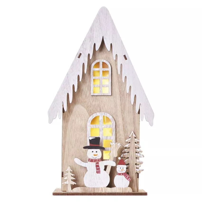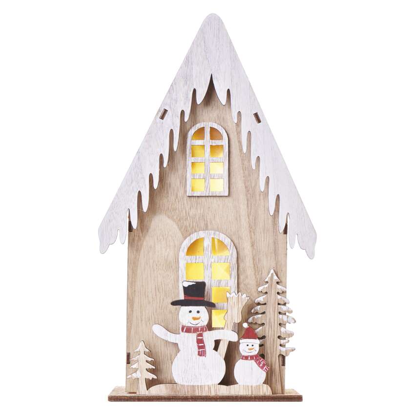 Dekoracje - 3 LED drewniany domek z bałwankami, 28 cm, 2x AA, ciepła biel, IP20, timer