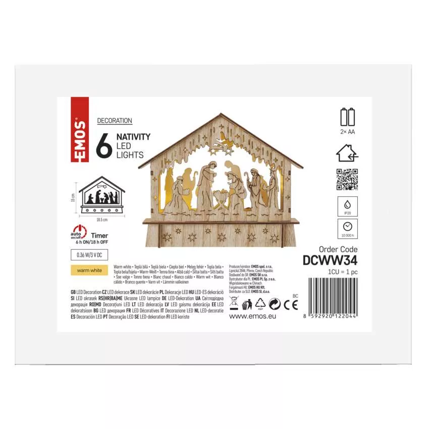 Dekoracje - 6 LED szopka 18,5x15 cm 2x AA, ciepła biel, IP20, timer