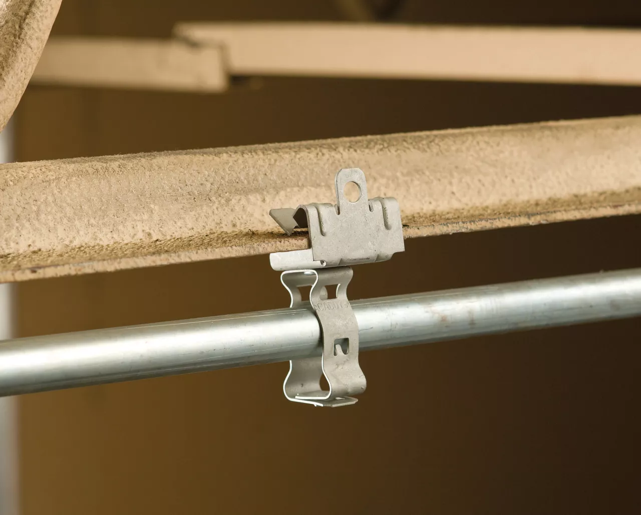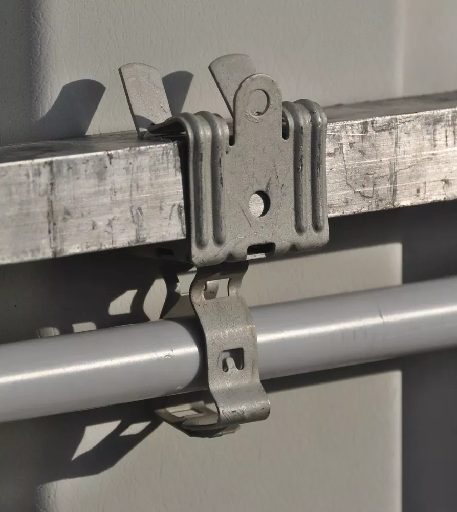 Zapewnia podporę dla rury/rury osłonowej lub przewodu mocowanego do półek belek. Zacisk obraca się o pełne 360°. Do montażu potrzebny jest tylko młotek.