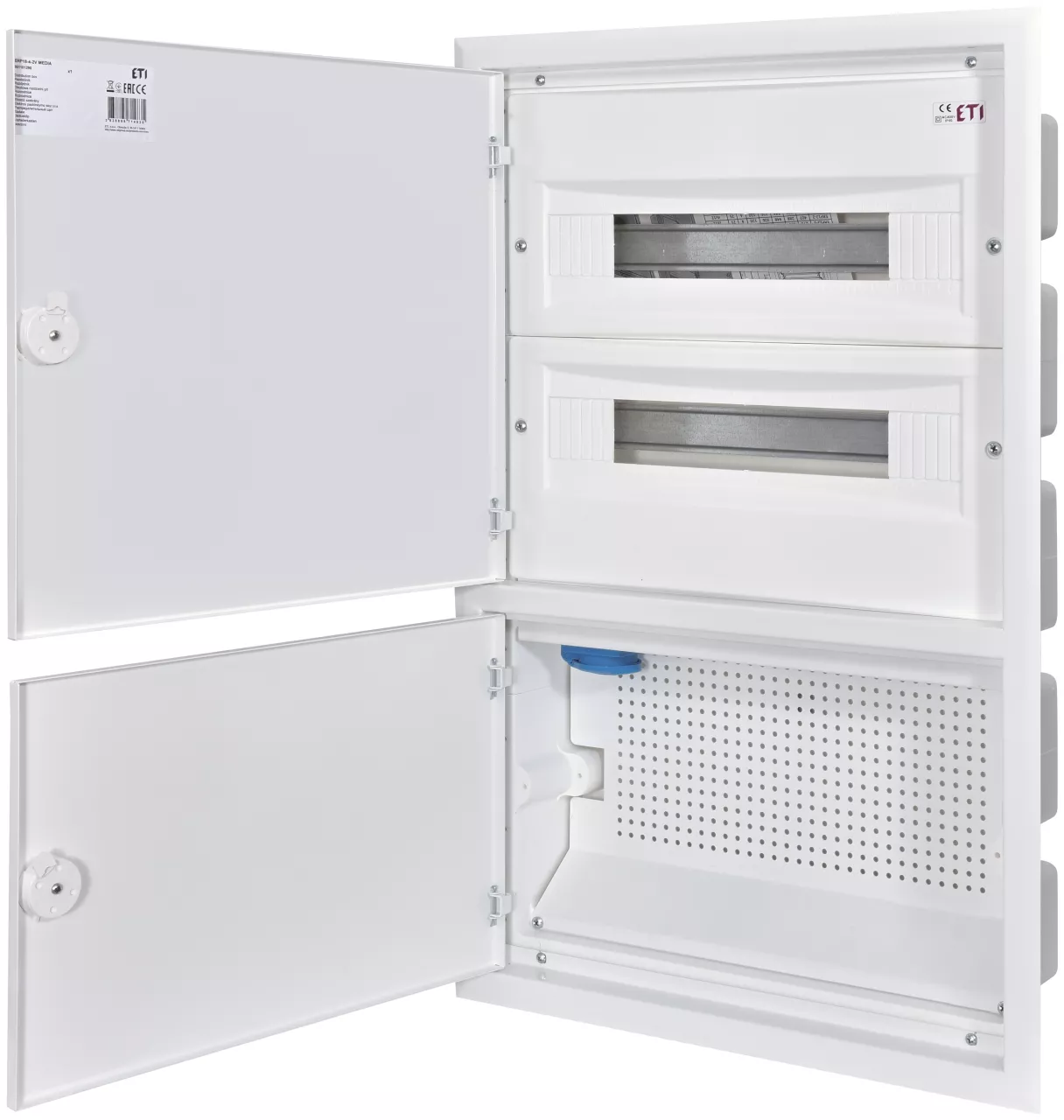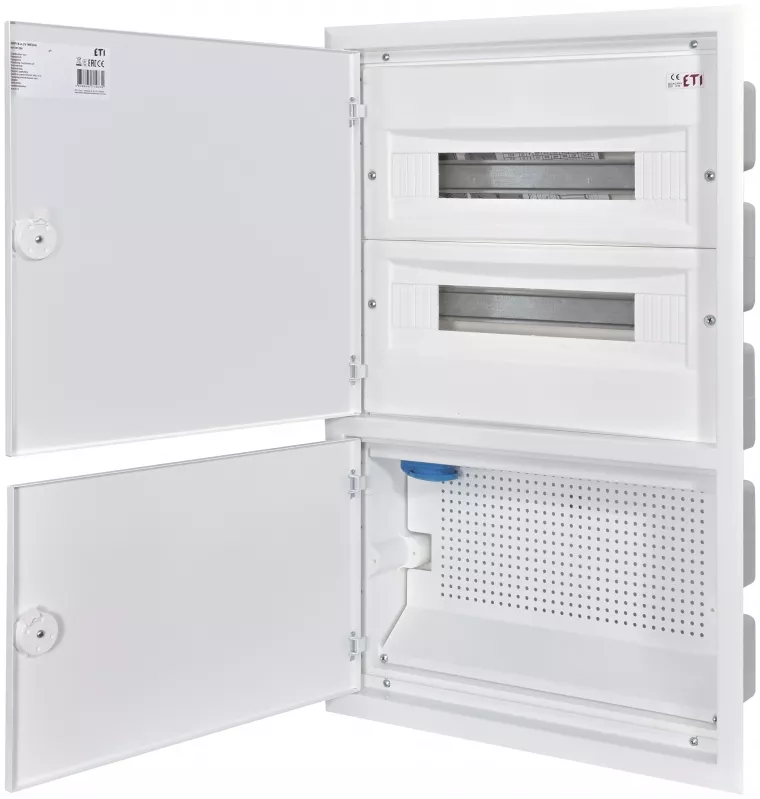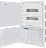 2 rzędy po 18 modułów + część medialna. Wyposażenie części medialnej:gniazdko 230V, perforowana płyta montażowa z otworami:18xRJ(001101367) + 2x SC(001101391) + 4xF(001101365)