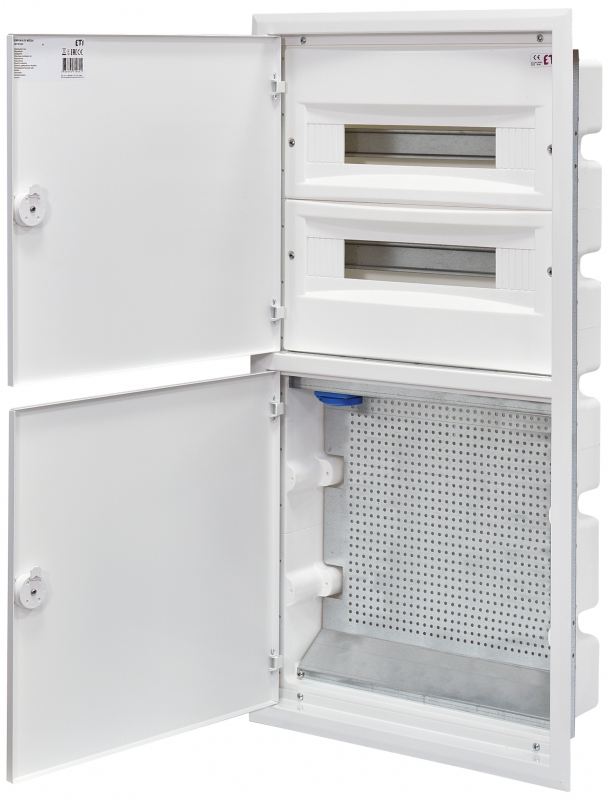 2 rzędy po 18 modułów + część medialna. Wyposażenie części medialnej:gniazdko 230V, perforowana płyta montażowa z otworami:18xRJ(001101367) + 2x SC(001101391) + 4xF(001101365)