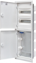 2 rzędy modułówki + część multimedialna. Wyposażenie części medialnej:gniazdko 230V, perforowana płyta montażowa z otworami : 8xRJ(001101367) + 1x SC(001101391) + 3xF (001101365)