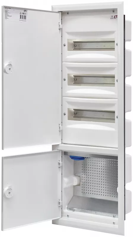 3 rzędy modułówki + część multimedialna. Wyposażenie części medialnej: gniazdko 230V, perforowana płyta montażowa z otworami : 8xRJ(001101367) + 1x SC(001101391) + 3xF (001101365)