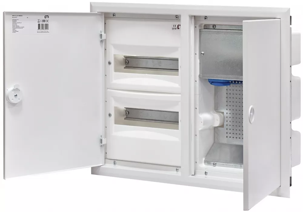 2 rzędy modułówki+ obok obudowa na część medialną. Wyposażenie części medialnej:gniazdko 230V, perforowana płyta montażowa z otworami : 8xRJ(001101367) + 1x SC(001101391) + 3xF (001101365)