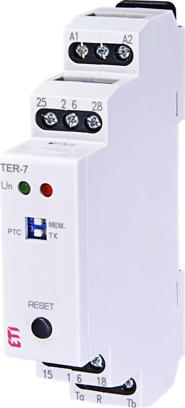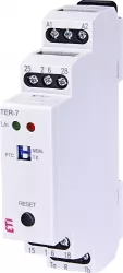 Termostat Ter-7 służy do ochrony uzwojeń silników elektrycznych przed przegrzaniem przy przeciążeniach. Odpowiedzią na przekroczenie ustalonego poziomu temperatury jest zmiana stanu zestyku zgodniez diagramem działania.Przekaźnik przystosowany jest do współpracy wyłącznie z czujnikiem PTC