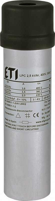 Trójfazowe kondensatory LPC są przeznaczone do kompensacji mocy biernej odbiorników indukcyjnych w systemach kompensacji indywidualnej, grupowej i centralnej.