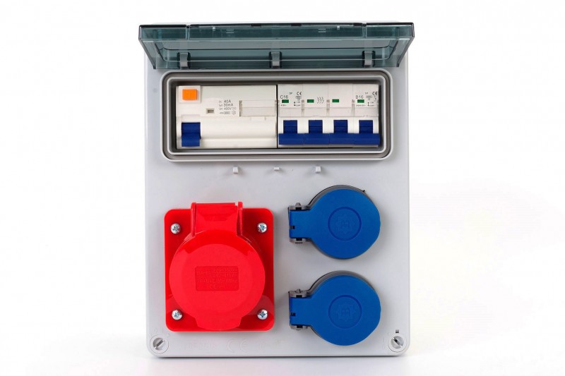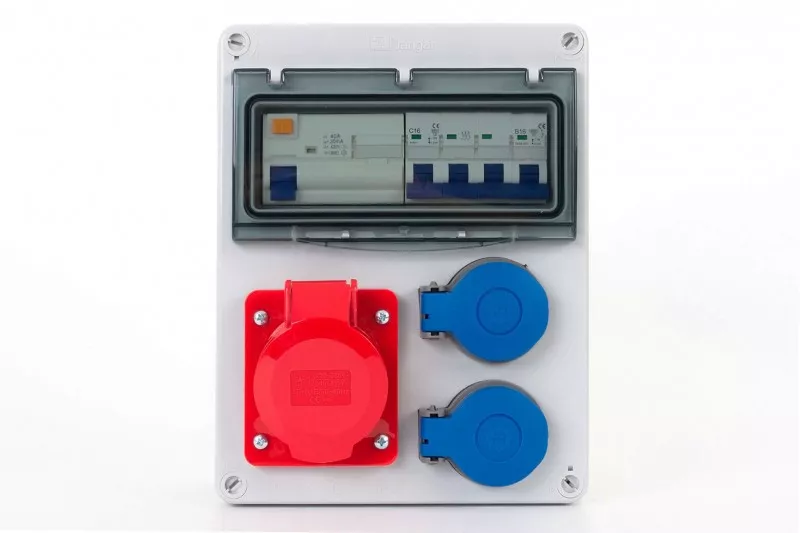 Rozdzielnica R-240 8M - gniazda 16A 5p, 2x230V z zabezpieczeniami R4P40A typ AC, 3FC16A, 1FB16A FE IP44