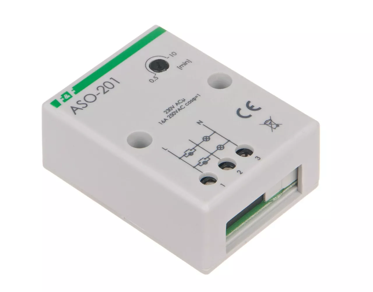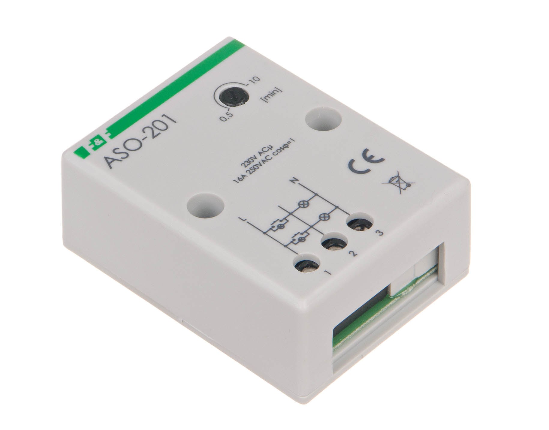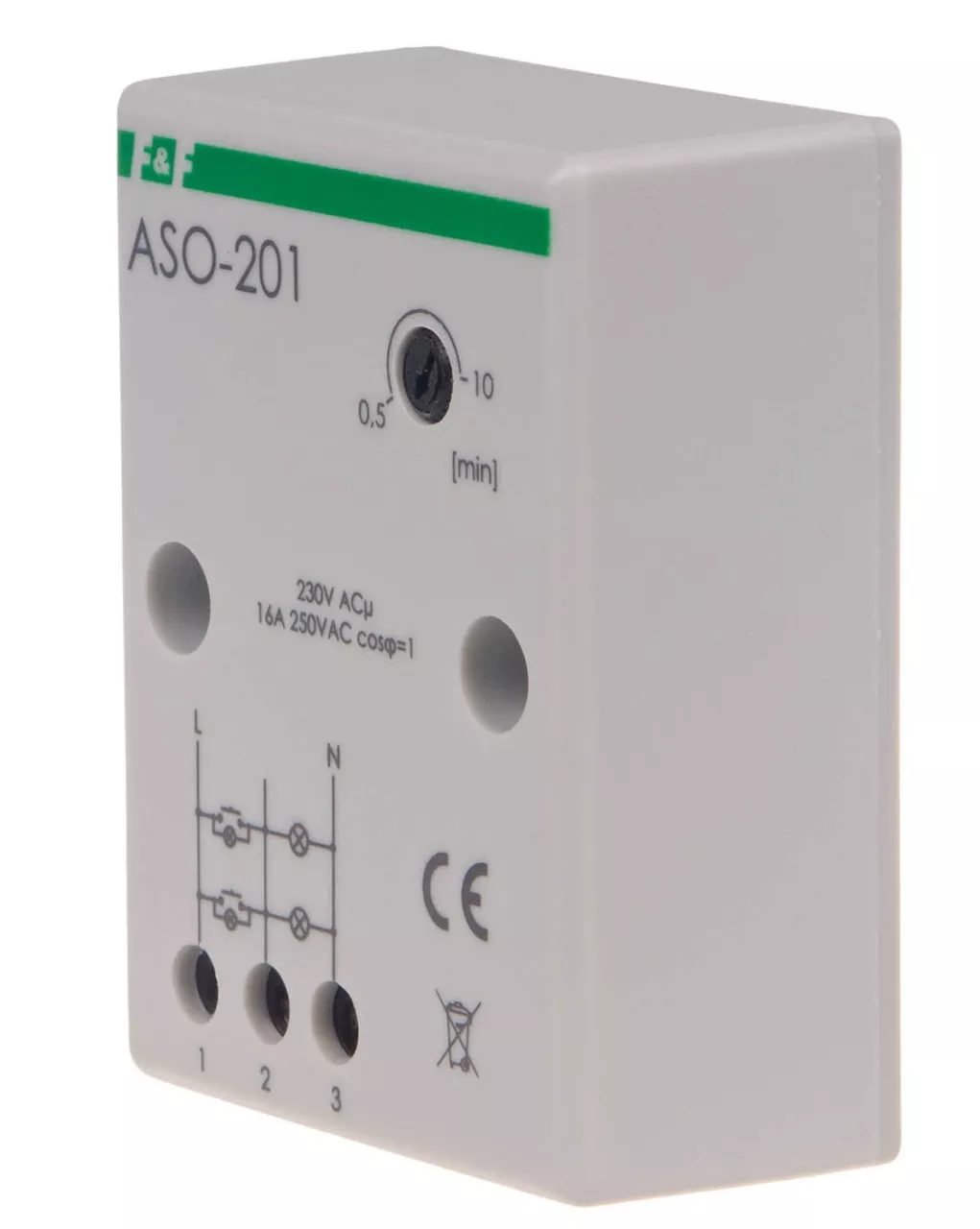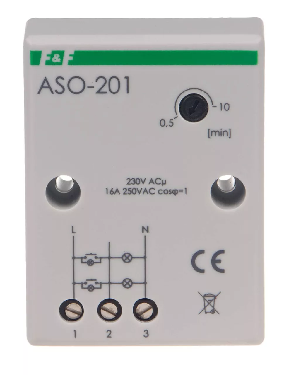 Napięcie zasilania 230 V AC Maksymalny prąd obciążenia AC-1 16 A Element wykonawczy przekaźnik Konfiguracja styków 1 × NO Separacja styku NIE Opóźnienie zadziałania mniej niż 1 s Opóźnienie wyłączenia - regulowane 0,5 ÷ 10 min Przeciwblokada NIE Sygnalizacja wyłączenia NIE Współpraca z przyciskami podświetlanymi TAK Przyłącze zaciski śrubowe 4,0 mm² Moment dokręcający 0,5 Nm Pobór mocy 0,56 W Temperatura pracy -25 ÷ 50 °C Wymiary 51×67×26 mm (± 1 mm) Montaż natynkowy Stopień ochrony IP20
