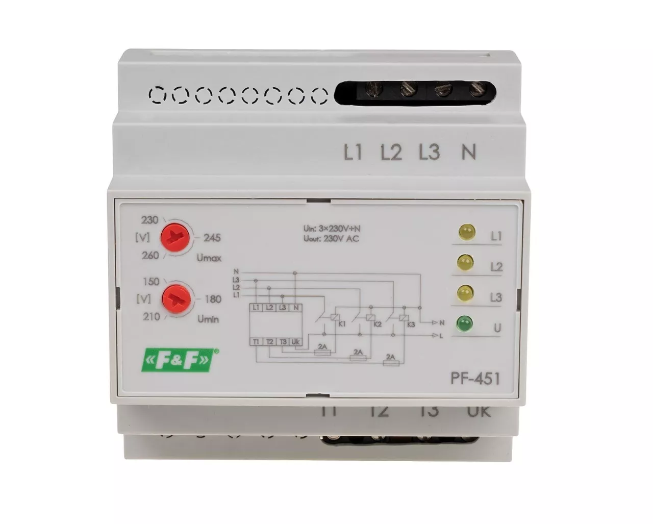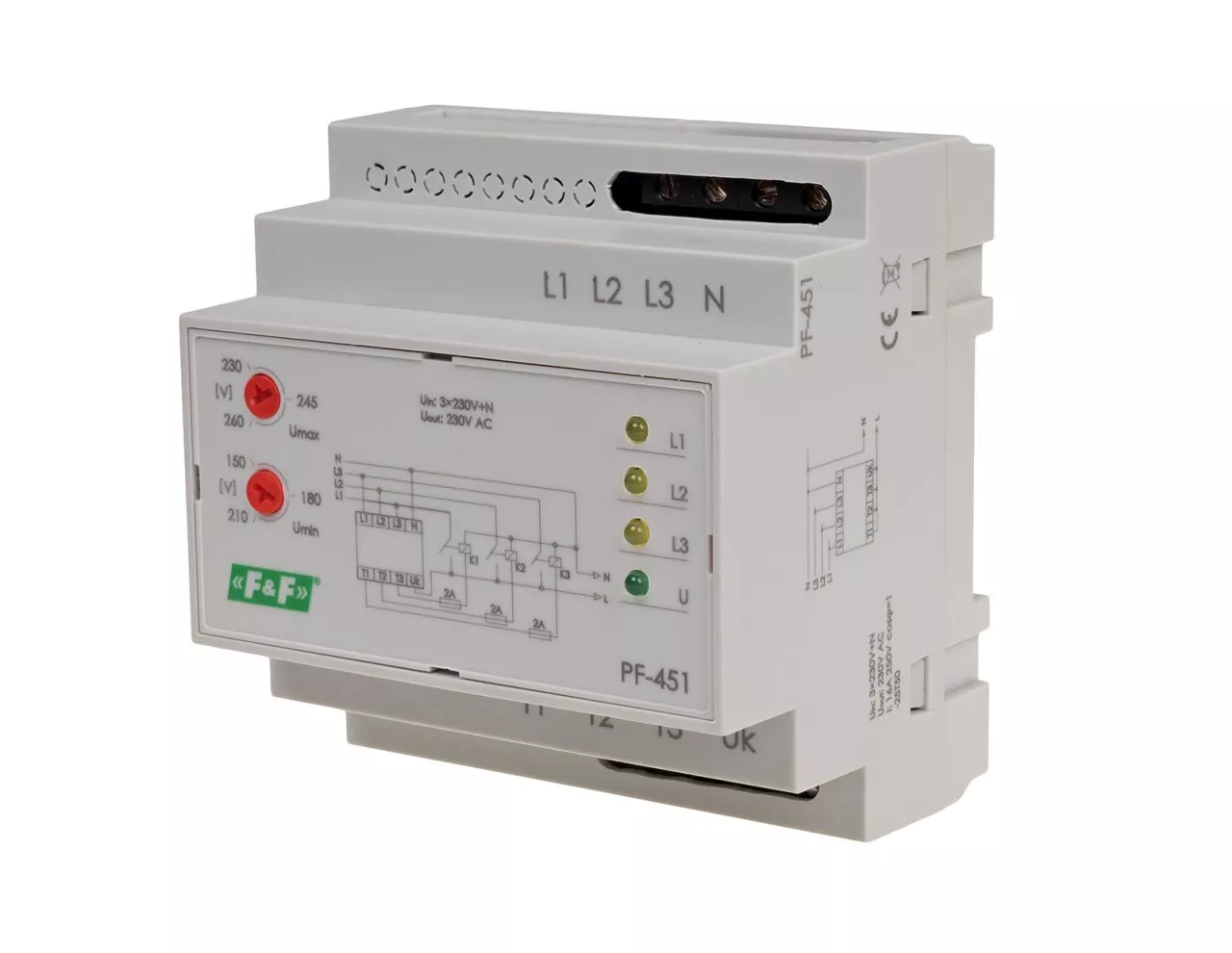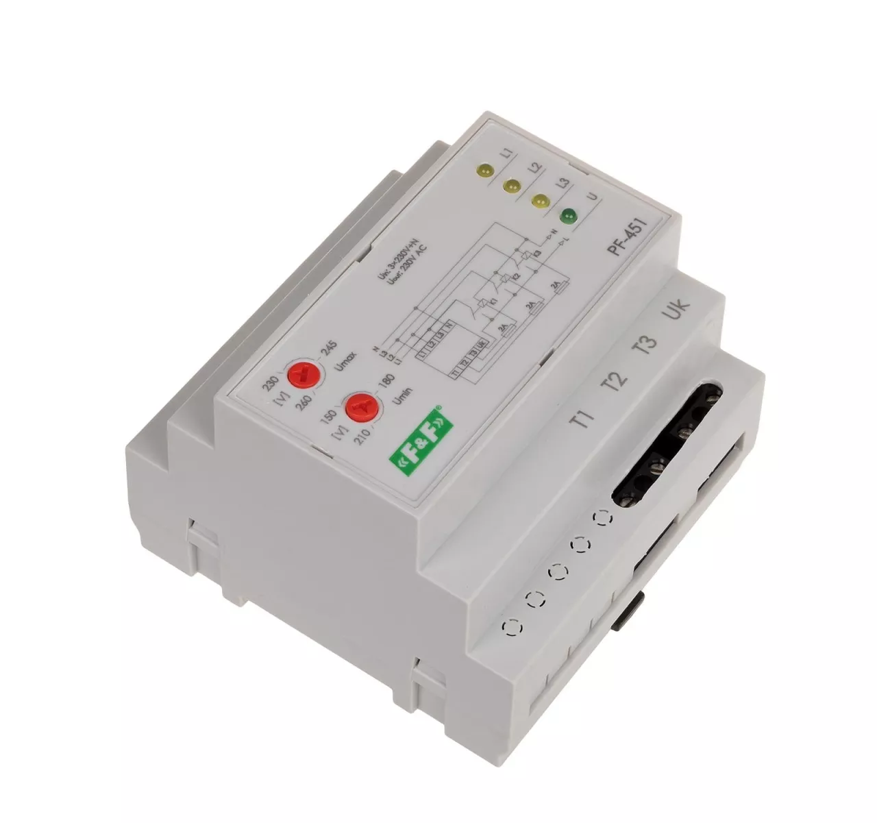 Napięcie zasilania 3×230 V+N Współpraca z agregatami prądotwórczymi TAK Histereza 5 V Błąd pomiaru napięcia ±1% Próg zadziałania - górny regulowany 230÷260 V Próg zadziałania - dolny regulowany 150÷210 V Czas przełączania 0,5÷0,8 s Maksymalny prąd obciążenia - bezpośrednie podłączenie 16 A Maksymalny prąd obciążenia - ze stycznikami do obciążalności styków styczników Przyłącze zaciski śrubowe 4,0 mm² Moment dokręcający 0,5 Nm Pobór mocy ≤ 1 W Temperatura pracy -25 ÷ 50 °C Wymiary 5 modułów (87,5 mm) Montaż na szynie 35 mm Stopień ochrony IP20