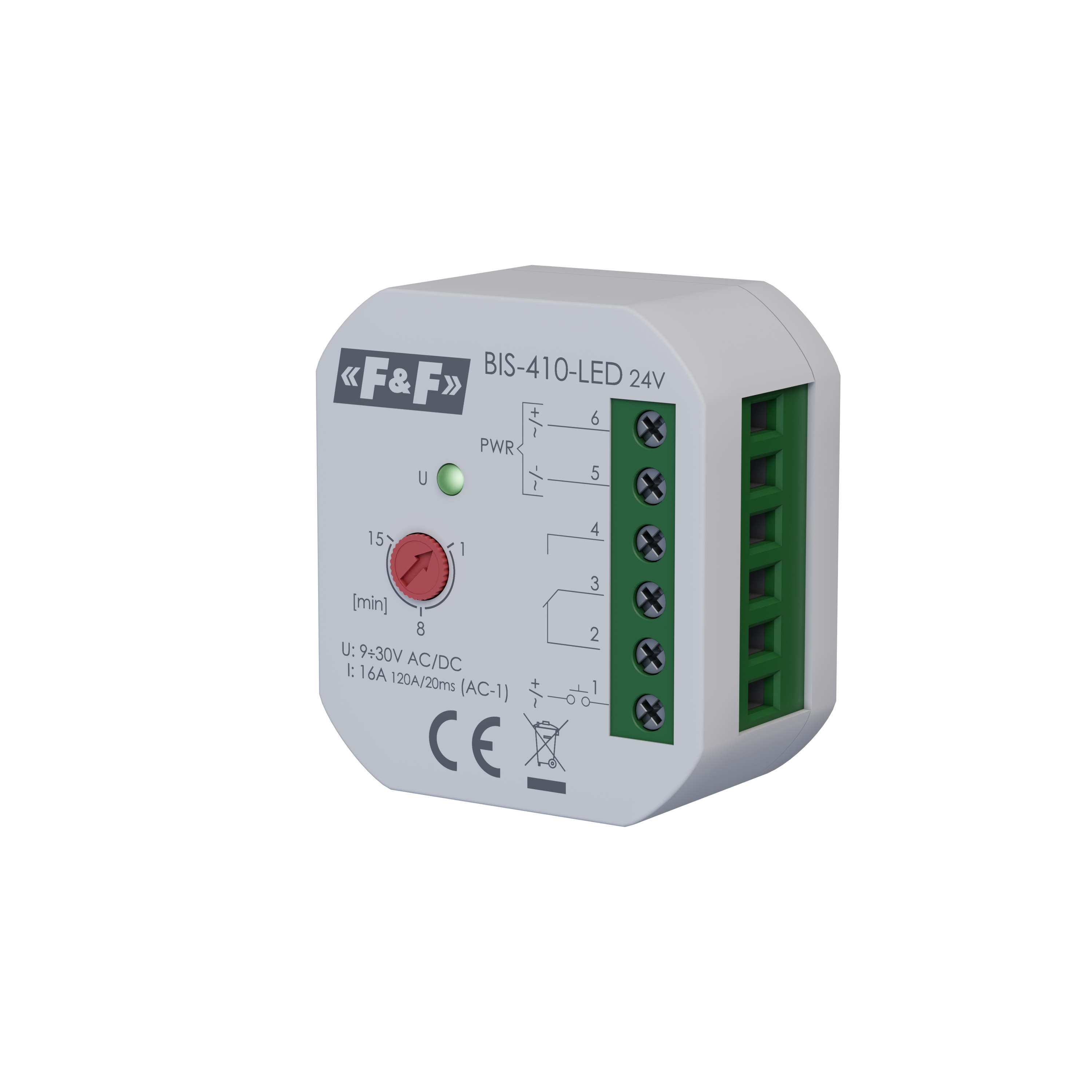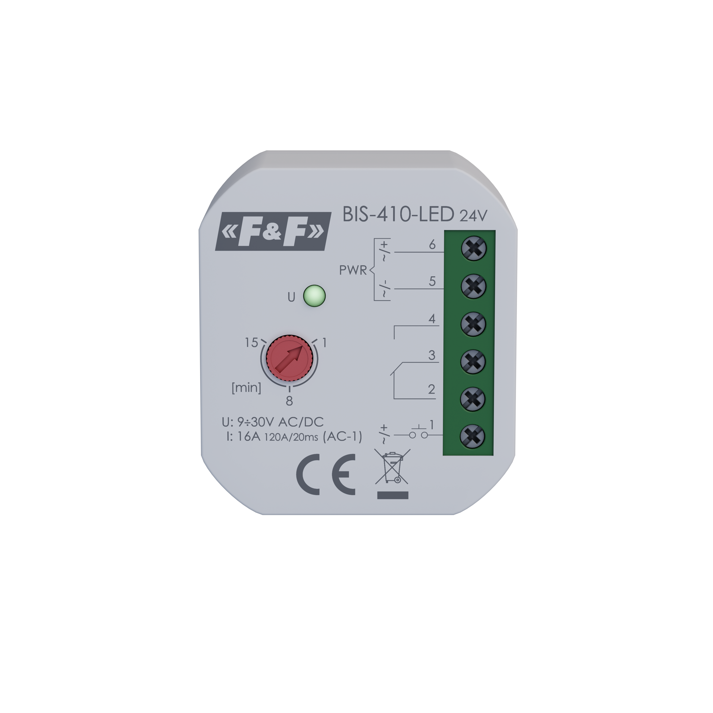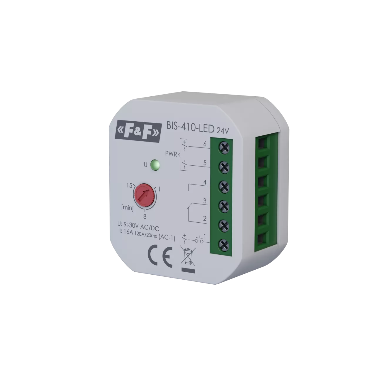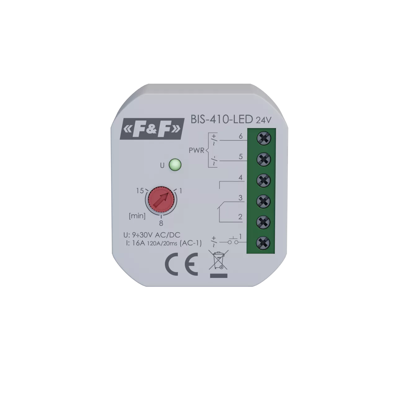Przekaźnik bistabilny, podtynkowy z wyłącznikiem czasowym 9÷30 V AC/DC, do podświetlanych przycisków z przekaźnikiem inrush