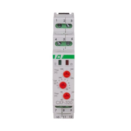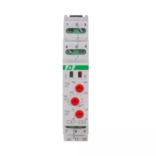 Napięcie zasilania 3 × 400 V + N Współpraca z agregatami prądotwórczymi NIE Kontrola zaniku / asymetrii faz TAK Kontrola kolejności faz TAK Kontrola styków stycznika NIE Element wykonawczy przekaźnik Maksymalny prąd obciążenia 2 × 8 A Konfiguracja styków 2 × NO/NC Separacja styku TAK Minimalne napięcie fazy 150 V Maksymalne napięcie fazy 280 V Zakres regulacji dolnego progu napięciowego 180÷220 V Zakres regulacji górnego progu napięciowego 240÷280 V Histereza napięciowa 5 V Opóźnienie wyłączenia 1÷10 s Opóźnienie załączenia 1÷60 s Kontrola zasilania 2 × LED Opóźnienie wyłączenia przy asymetrii i zaniku 1÷10 s Opóźnienie wyłączenia przy braku fazy 1 s Przyłącze zaciski śrubowe 2,5 mm² Moment dokręcający 0,4 Nm Pobór mocy 1,6 W Temperatura pracy -25÷40°C Wymiary 1 moduł (18 mm) Montaż na szynie 35 mm Stopień ochrony IP20
