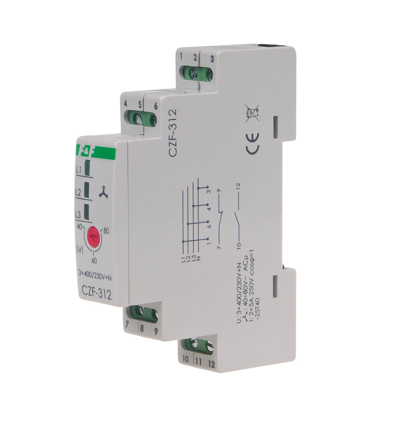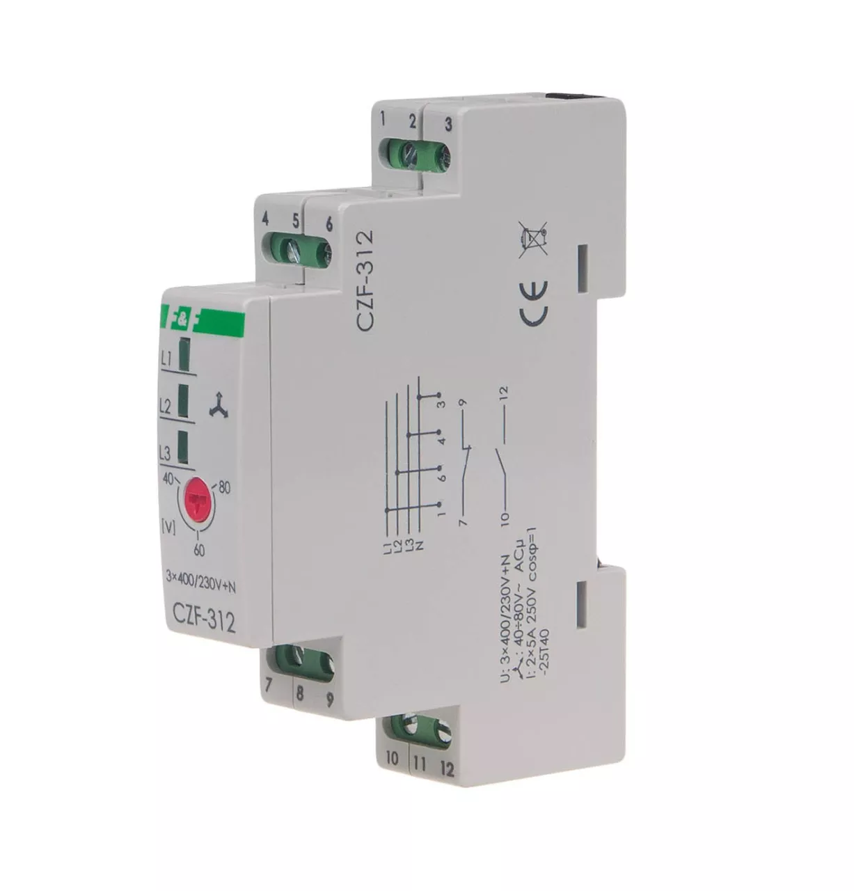 Napięcie zasilania 3 × 400 V + N Współpraca z agregatami prądotwórczymi NIE Kontrola zaniku / asymetrii faz TAK Kontrola kolejności faz NIE Kontrola styków stycznika NIE Element wykonawczy 2 × przekaźnik Maksymalny prąd obciążenia 2 × 5A Konfiguracja styków 1×NO+1×NC Separacja styku TAK Asymetria napięciowa zadziałania 40÷80 V Histereza napięciowa 5 V Opóźnienie wyłączenia 0,2 s Kontrola zasilania 3 × LED zielona Przyłącze zaciski śrubowe 2,5 mm² Moment dokręcający 0,4 Nm Pobór mocy 0,8 W Temperatura pracy -25÷40°C Wymiary 1 moduł (18 mm) Montaż na szynie 35 mm Stopień ochrony IP20