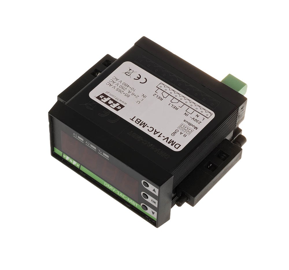 Typ woltomierz jednofazowy Napięcie zasilania 85÷265 V AC Konfiguracja styków 2 × NO/NC Separacja styku TAK Wejście pomiarowe separowane 10÷480 V AC Histereza alarmów 1 V÷150 V Dolny próg alarmów 10 V÷479 V Górny próg alarmów 11 V÷480 V Opóźnienie alarmów 0 s÷180 s Wyświetlacz 4-cyfrowy LED (wysokość cyfry 14 mm) Dokładność wskazań 1% Protokół komunikacyjny MODBUS RTU Prędkość - ustawiana 1200÷115200 bit/s Bity danych 8 Bity stopu 1 lub 2 Bity parzystości EVEN / ODD / NONE Adres 1÷247 Prąd obciążenia przekaźnika 6 A Przyłącze zaciski śrubowe 1,5 mm² Moment dokręcający 0,4 Nm Pobór mocy 2 W Temperatura pracy -10÷40°C Wymiary 72 ×36 ×72 mm Otwór montażowy 66 mm × 66 mm Montaż tablica Stopień ochrony IP20