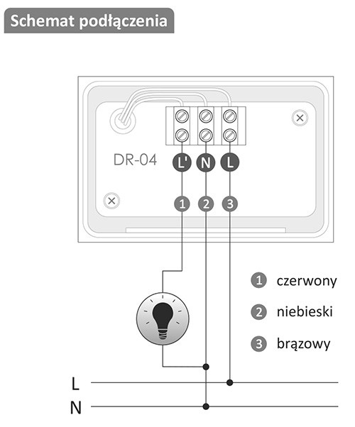 Napięcie zasilania 230 V AC Maksymalny prąd obciążenia AC-1 5 A Czas wyłączenia 10 s±3 s ÷ 15 min. (±2 min.) Próg aktywacji zmierzchowej 3÷2000 Lx Detekcja ruchu 0,6÷1,5 m/s Pole detekcji poziomej 0°÷180° Pole detekcji pionowej 0°÷45° Maks. regulowany promień detekcji (h: 2.5 m, Temp. ˂ 24 °C) 12 m Wysokość montażu czujnika 1,8÷2,5 m Zakres obrotu głowicy - w poziomie/w pionie 60°/180° Rodzaj detekcji promieniowanie podczerwone Przyłącze zaciski śrubowe 1,5 mm² Pobór mocy 0,5 W Temperatura pracy -20÷40°C Wymiary głowica rozłożona pionowo: S80×W52×G120 mm; głowica złożona poziomo: S80×W52×G95 mm Montaż natynkowy Stopień ochrony IP65 - hermetyczny Kolor Biały