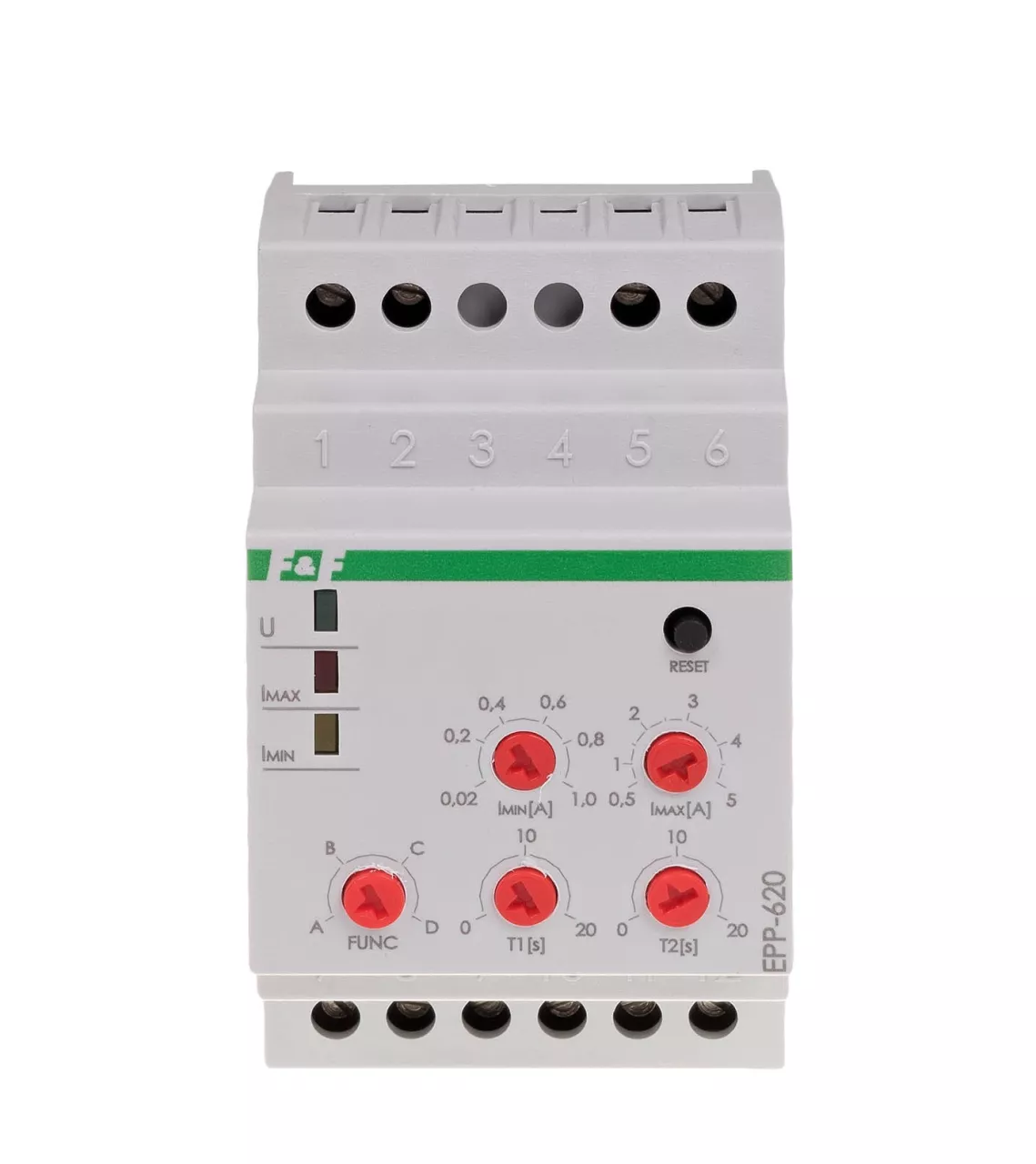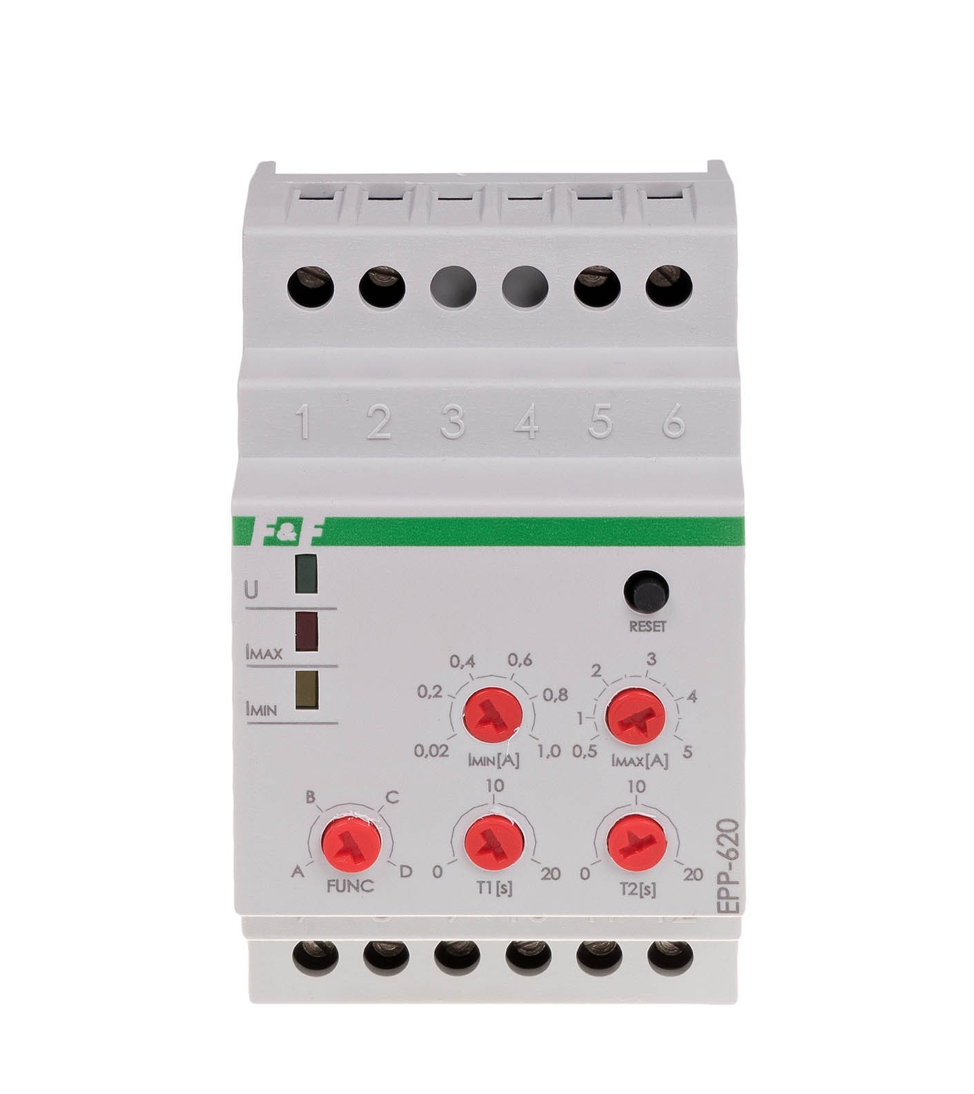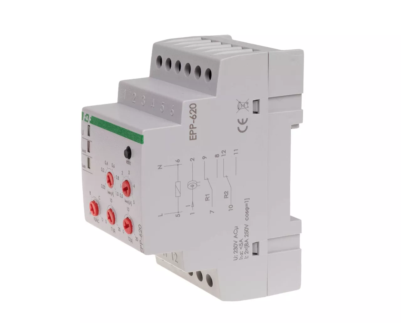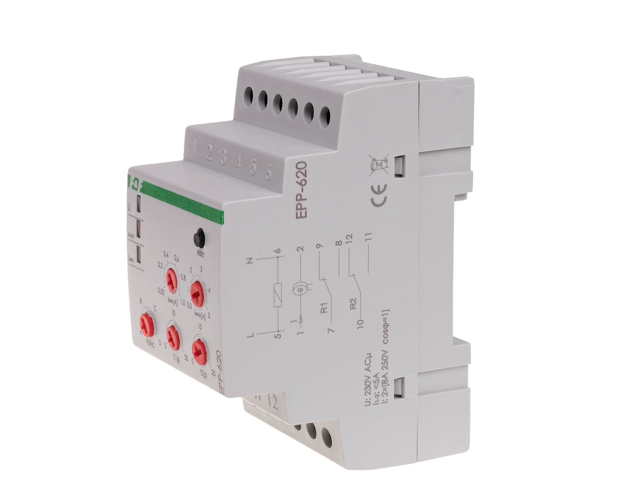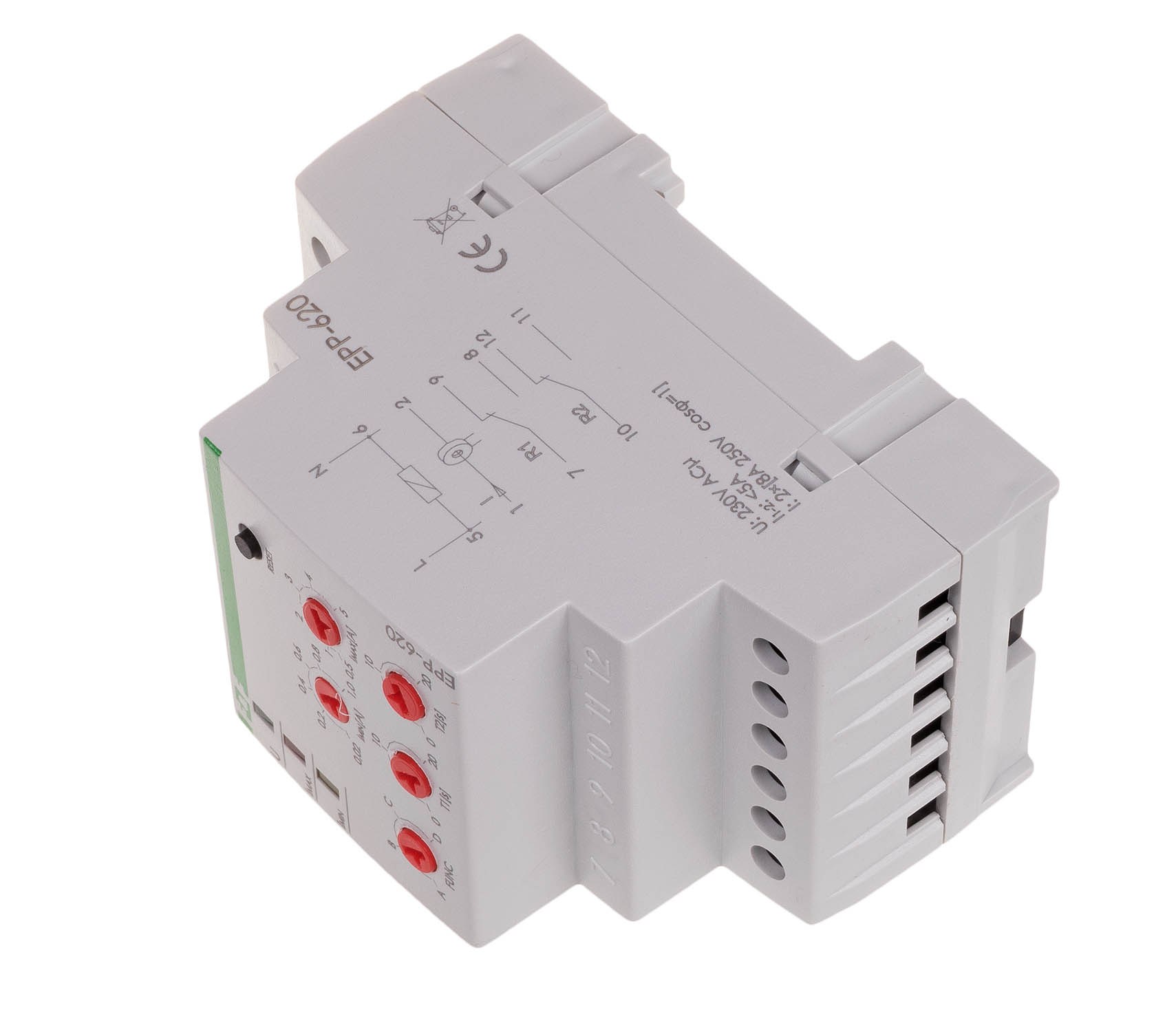 Napięcie zasilania 230 V AC Element wykonawczy 2 × przekaźnik Maksymalny prąd obciążenia R1 i R2 2 × 8 A Konfiguracja styków 2 × NO/NC Separacja styku TAK Czas powrotu 0,5 s Histereza powrotu zasilania 10% Maksymalny prąd wejścia pomiarowego 1-2 5 A Prąd przełączenia - regulowany Imin 0,02÷1 A Prąd przełączenia - regulowany Imax 0,5÷5 A Czas zadziałania T1 i T2 - regulowany 0÷20 s Przyłącze zaciski śrubowe 4,0 mm² Moment dokręcający 0,5 Nm Pobór mocy 0,4 W Temperatura pracy -25 ÷ 50 °C Wymiary 3 moduły (52,5 mm) Montaż na szynie 35 mm Stopień ochrony IP20